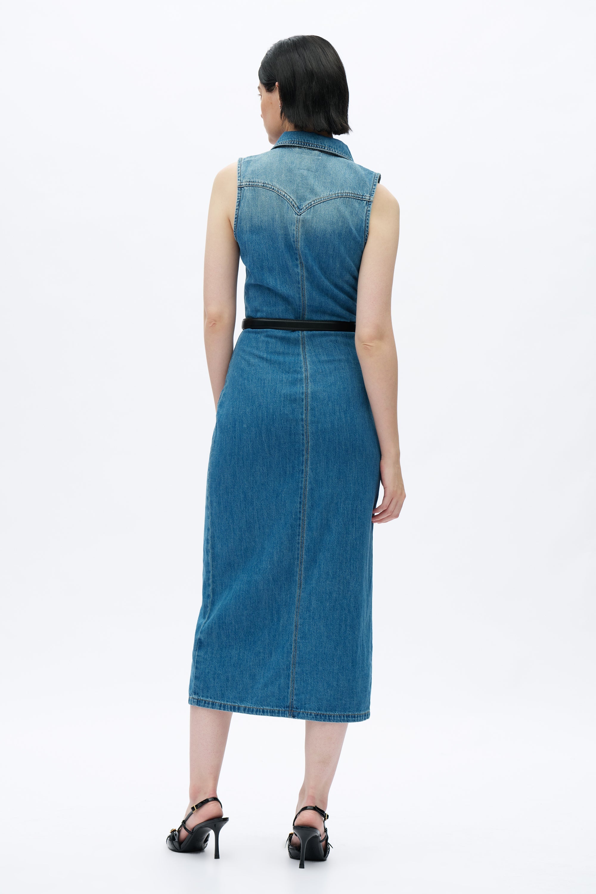 Medium blue slim-fit denim cardigan dress with button front closure. Non-stretch fabric hugs figure for sleek silhouette. Ideal for casual and chic styling.