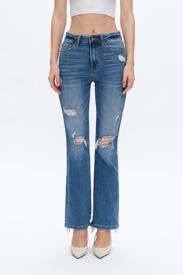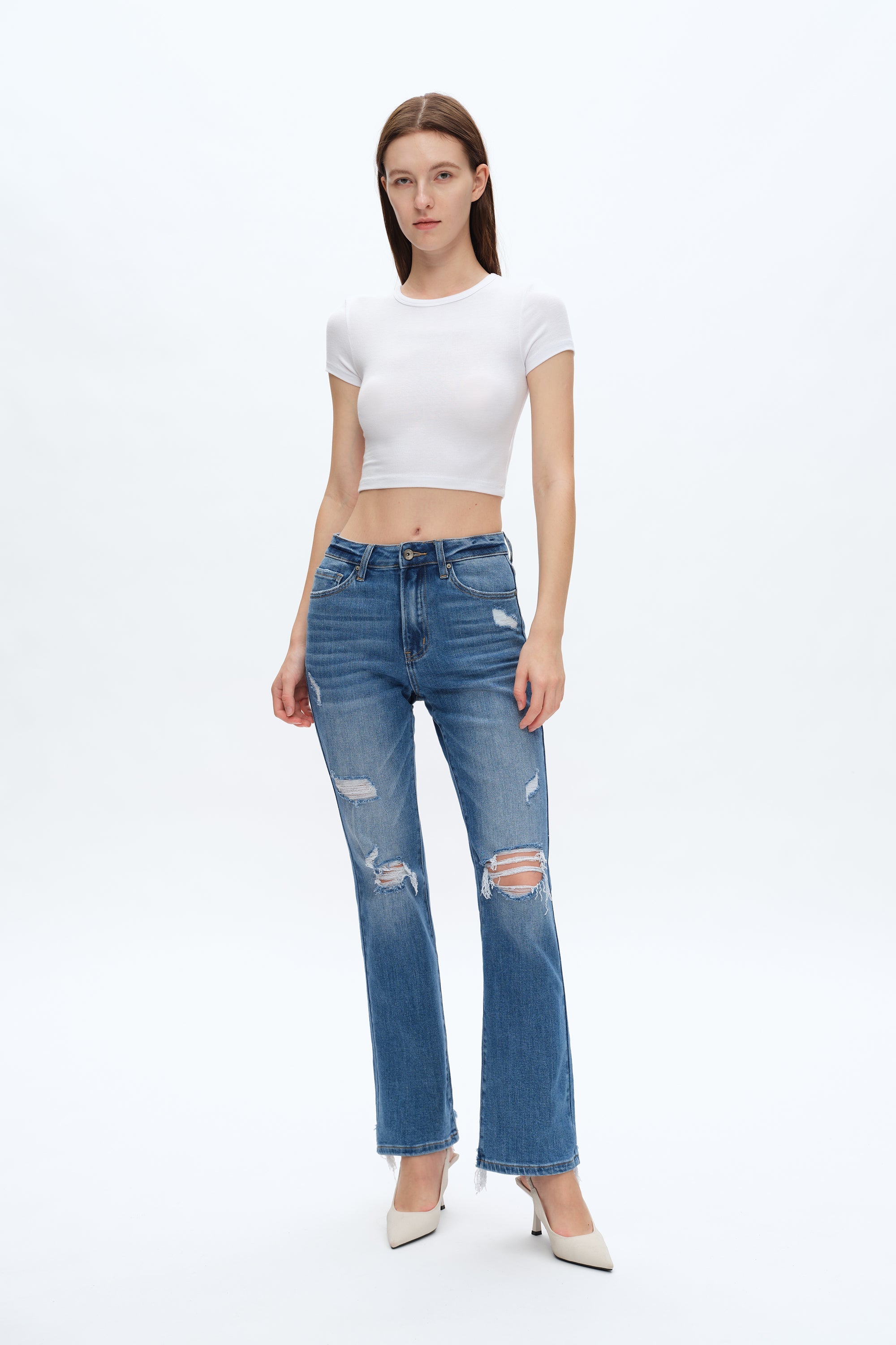 Ripped straight jeans with a flattering high-rise fit, distressed details, and raw hem finish, bringing edgy-cool vibes to your everyday style.
