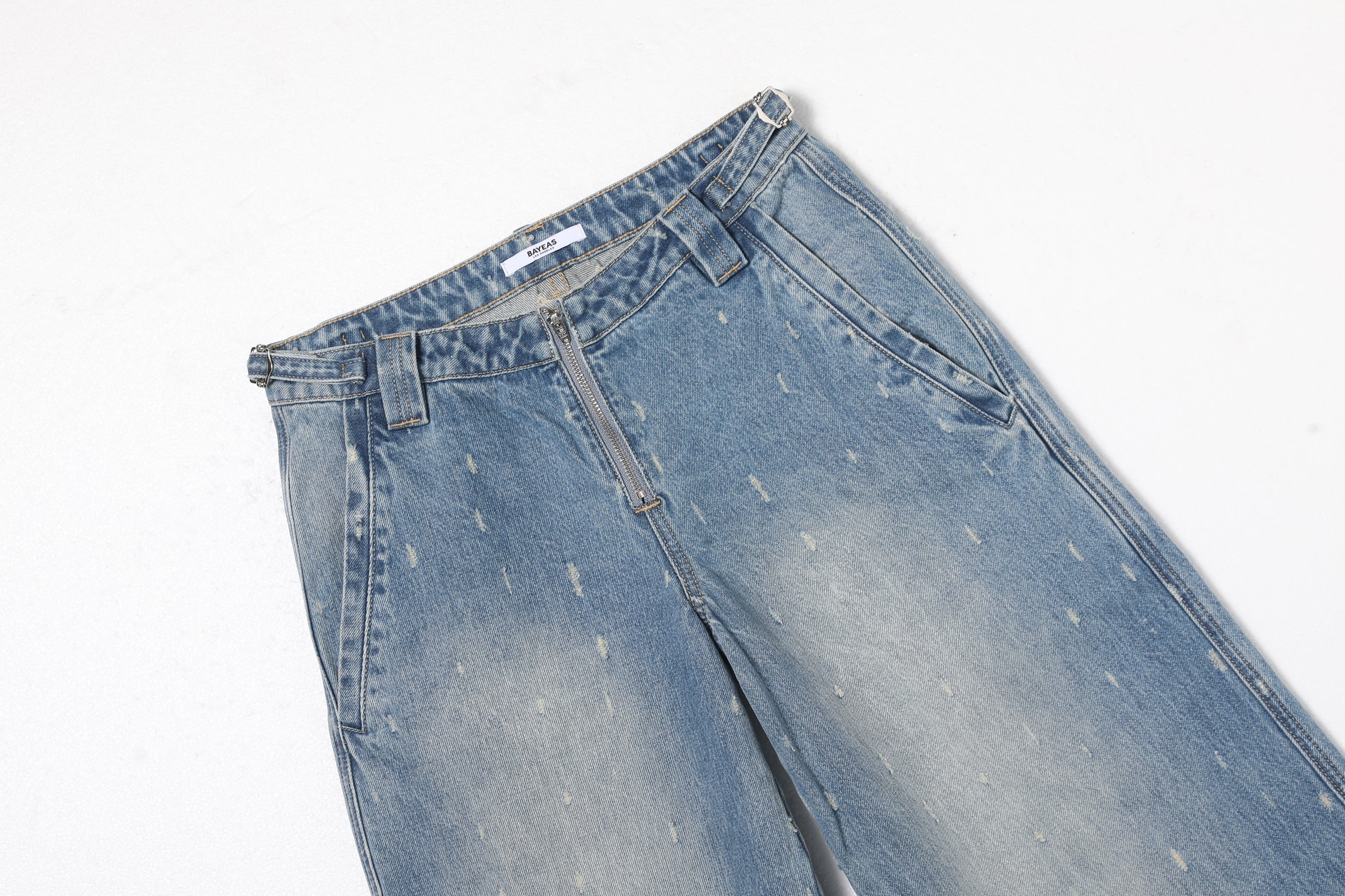 A modern take on low-rise jeans. The wide-leg silhouette is accented by a unique pin-dot pattern, a front zipper closure, and light blue faded wash.