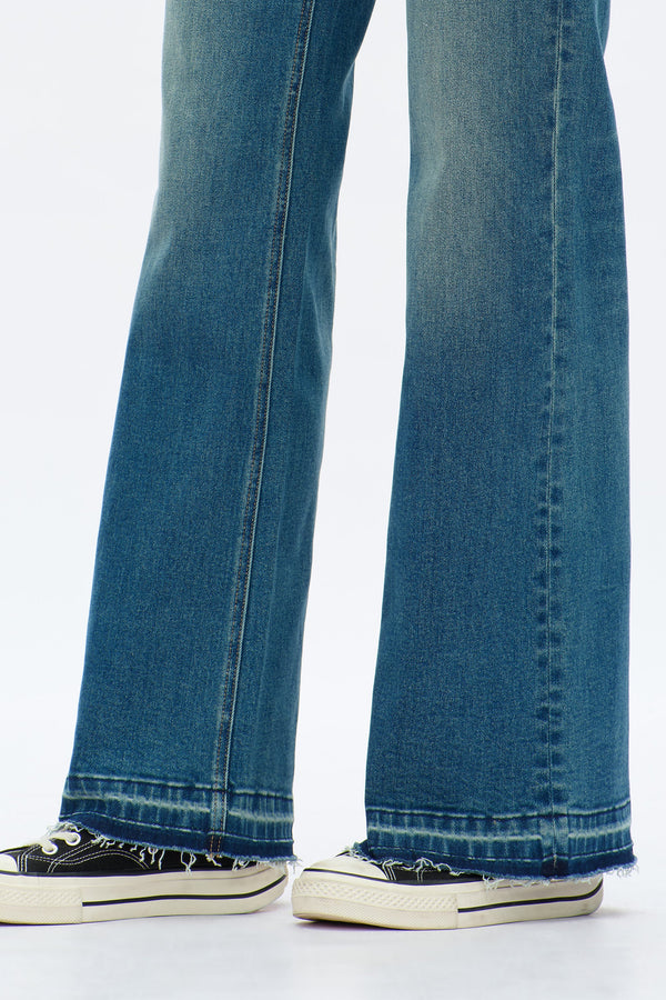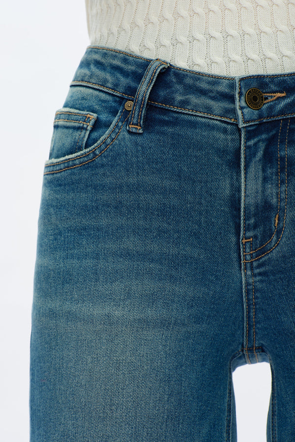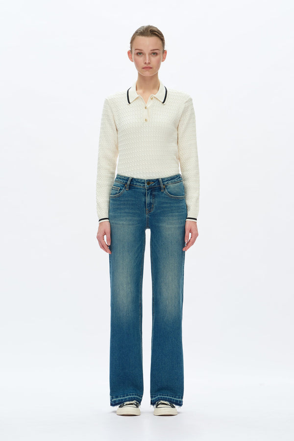 These jeans feature a low-rise fit and a relaxed wide leg that falls straight from the hip. The raw, frayed hem and distressed wash give them a casual, lived-in feel.