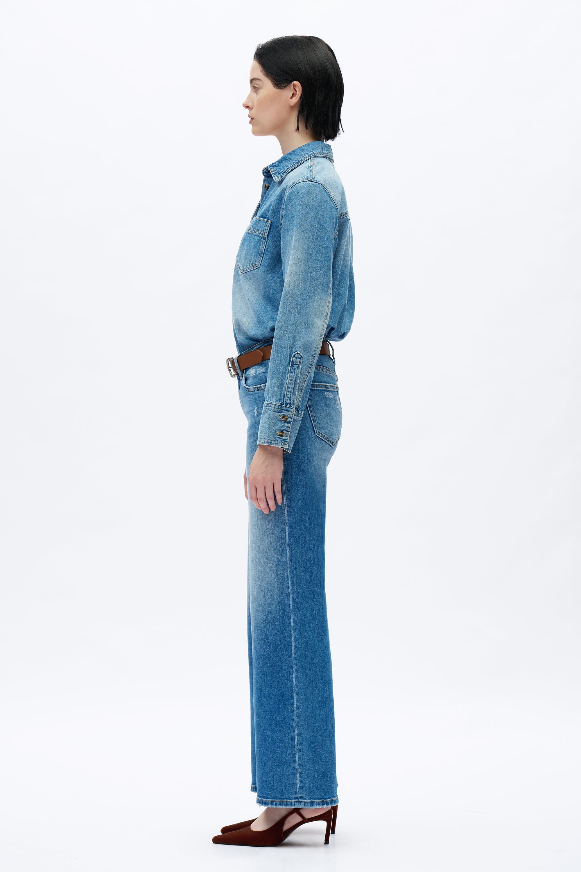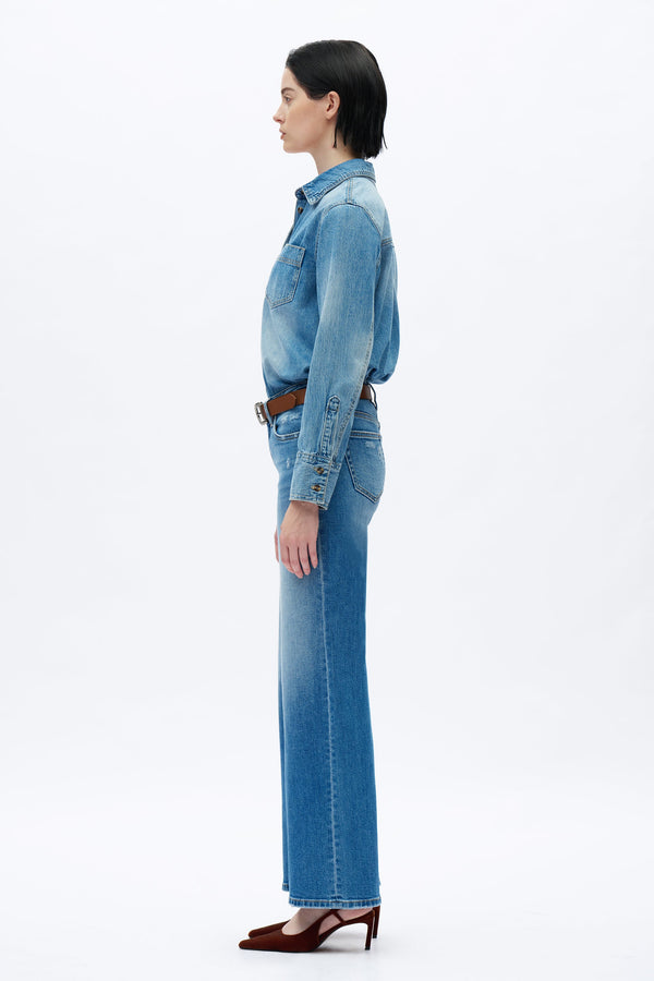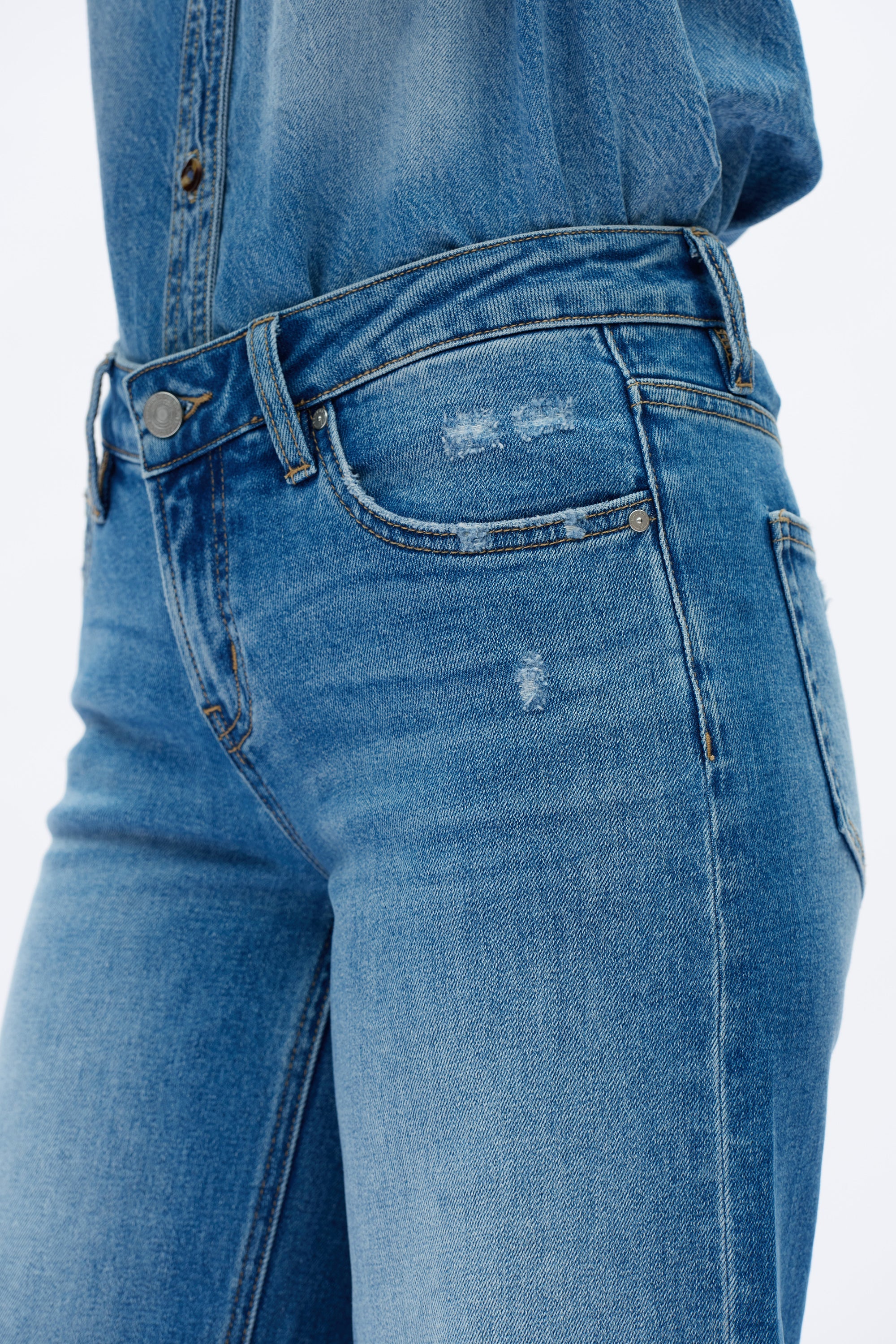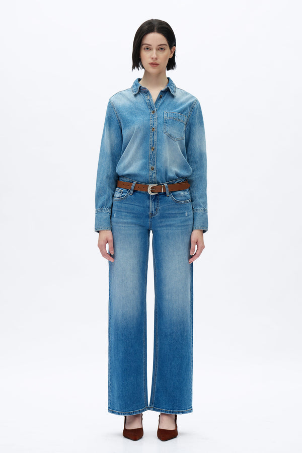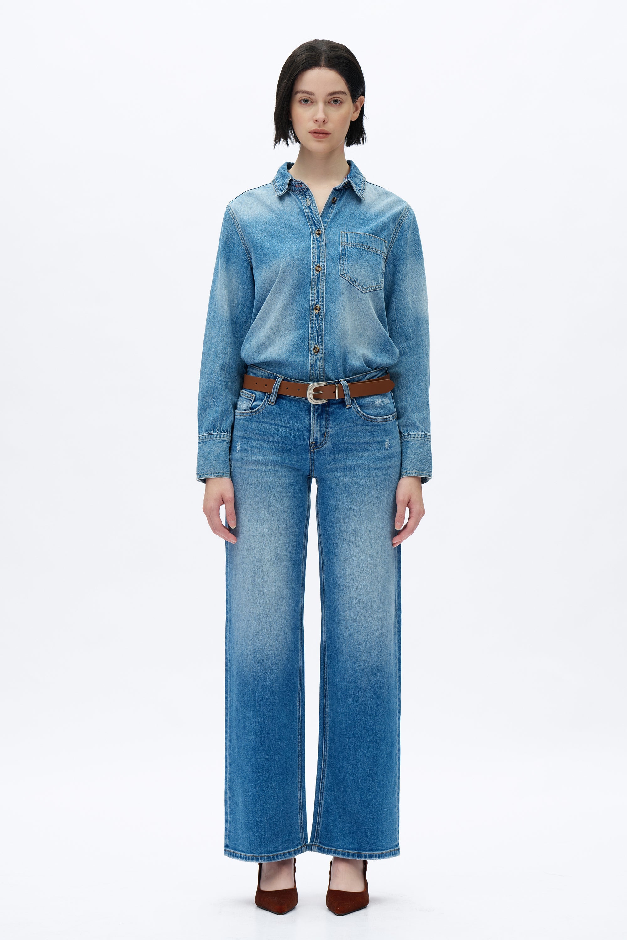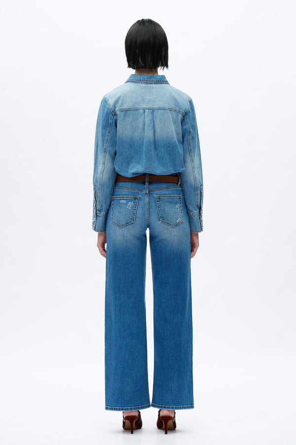 These jeans feature a low-rise fit and a relaxed wide leg. The light-to-dark faded denim wash and distressed details give them a casual, modern look.