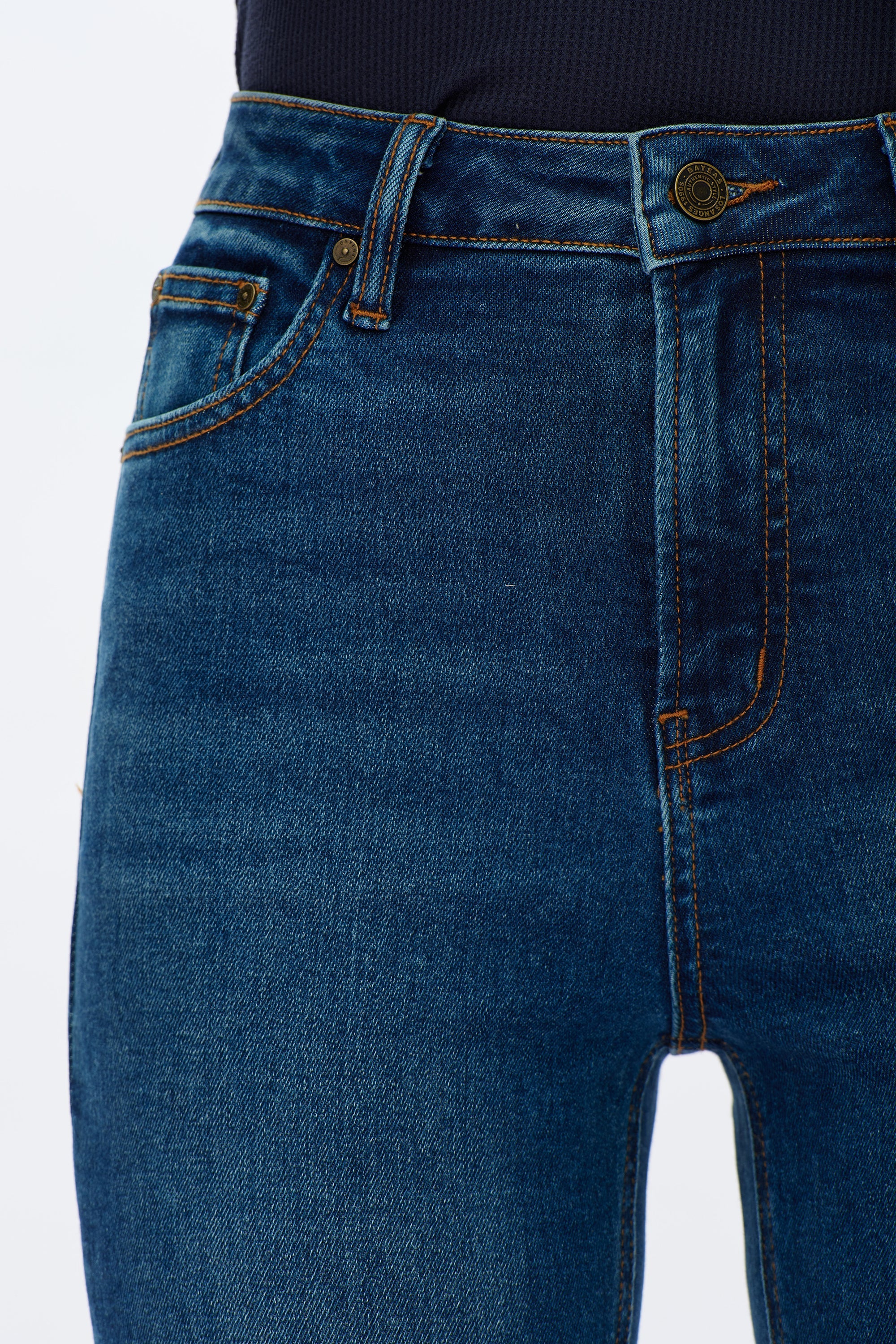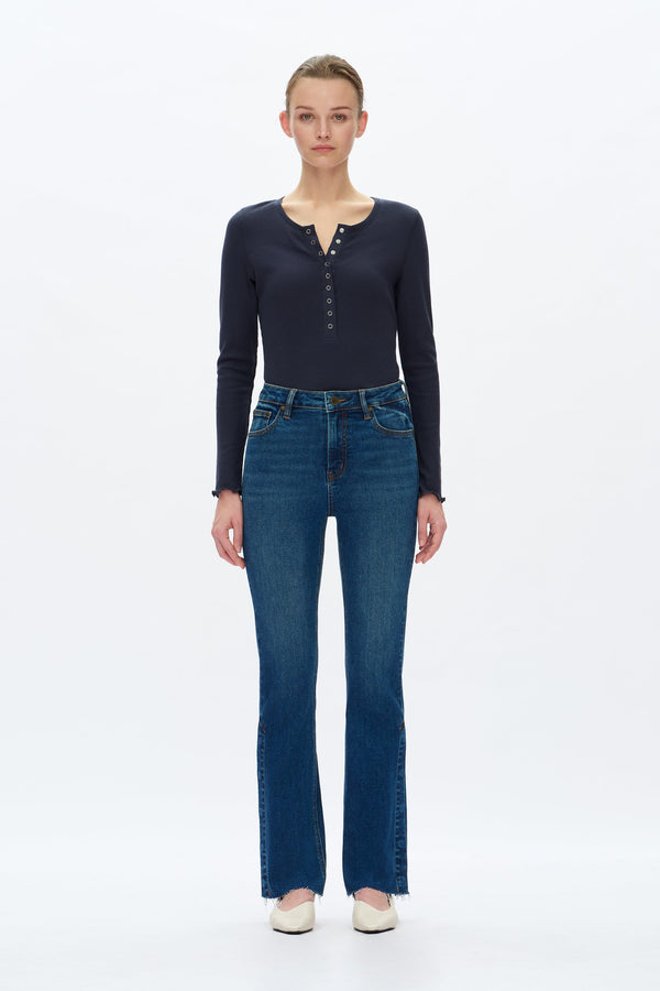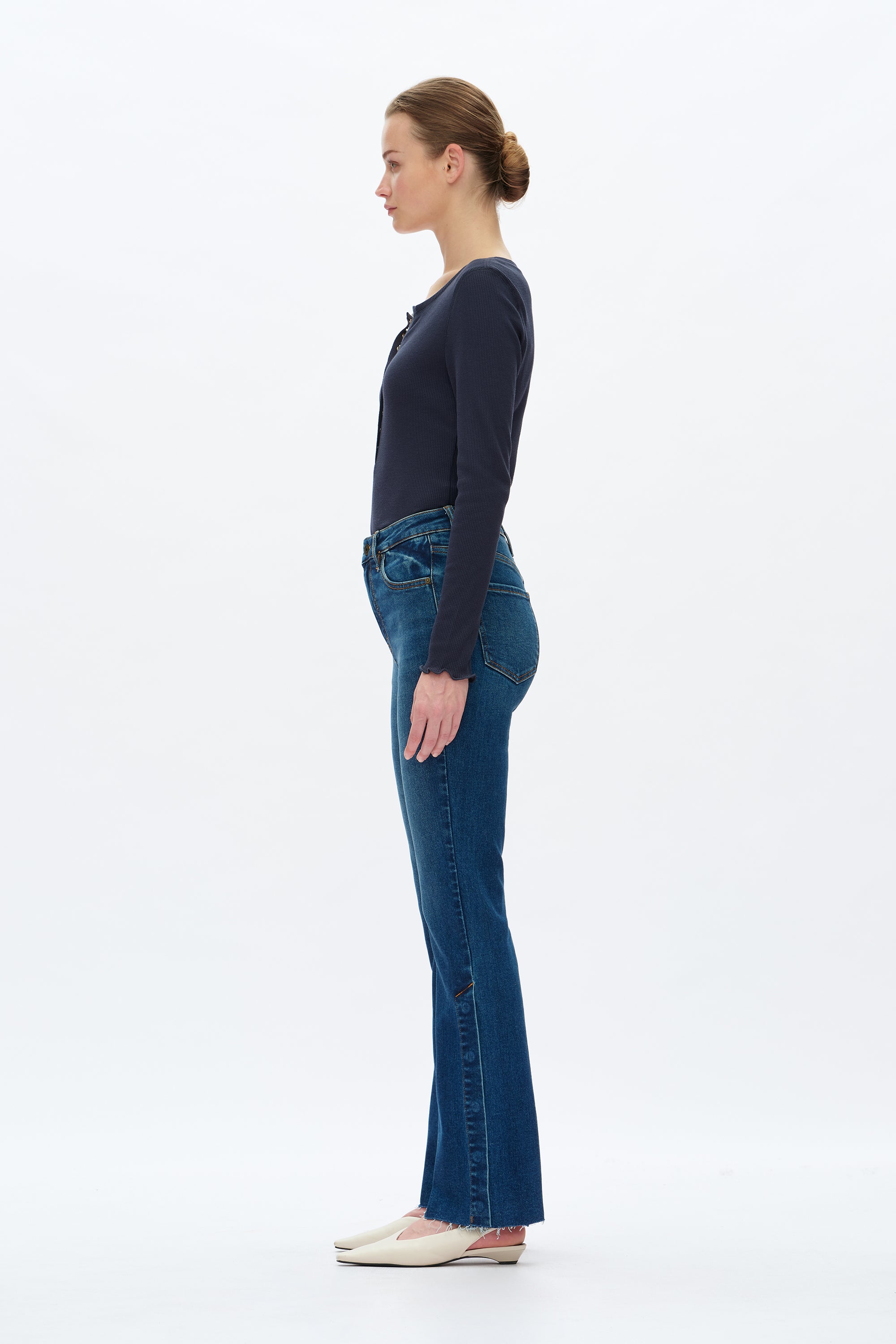 These jeans feature a high-rise fit and a bootcut leg. The dark blue denim has a light faded wash and a frayed hemline, with a subtle side seam detail.