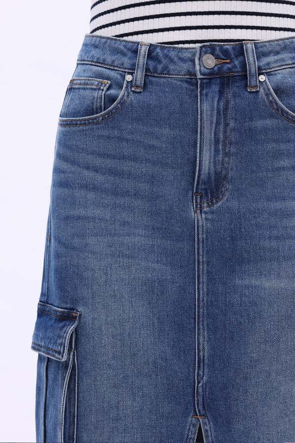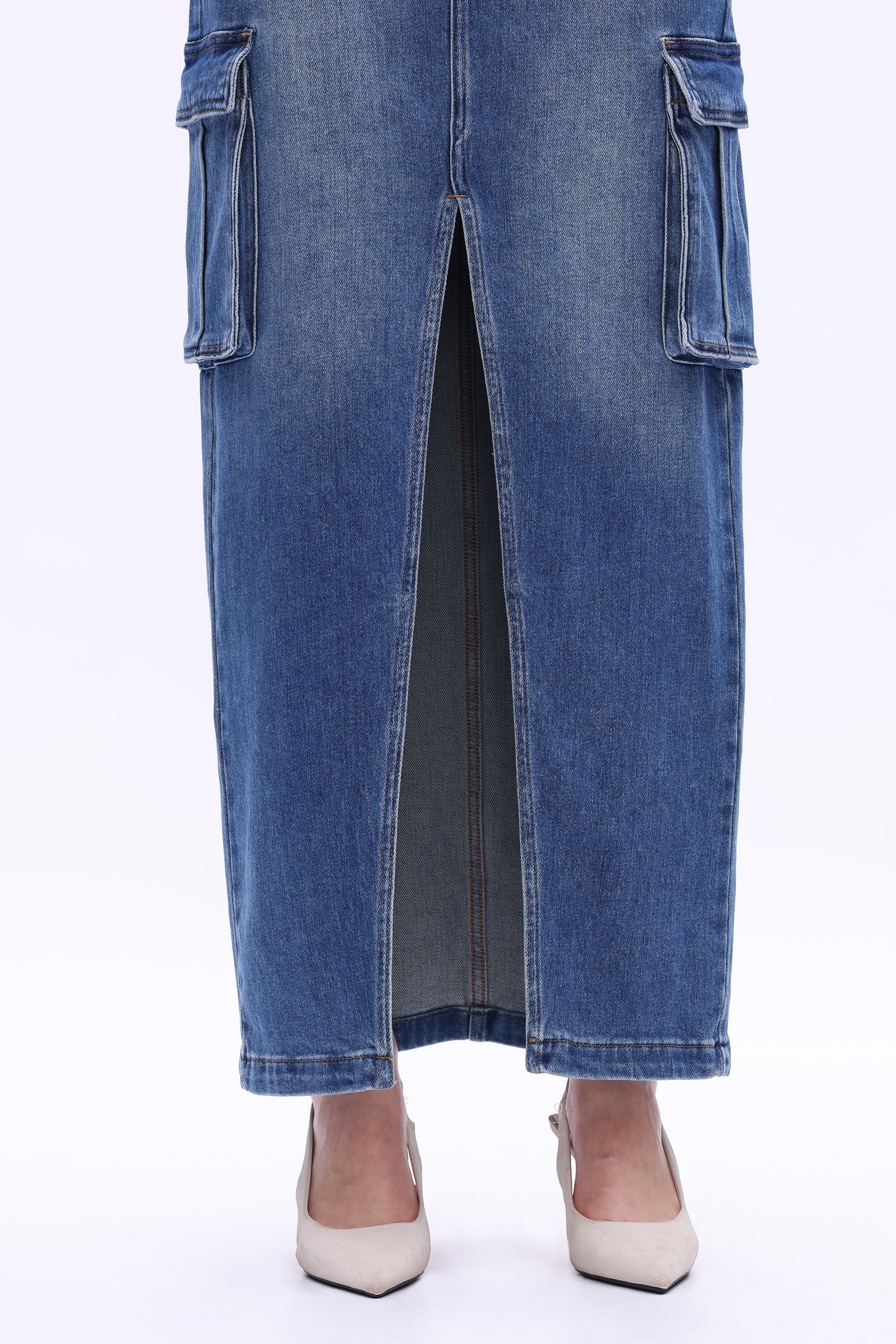 Mid rise cargo maxi skirt featured in a vintage style featuring five-pocket styling, sculpted side pockets and a front slit.