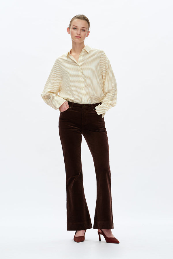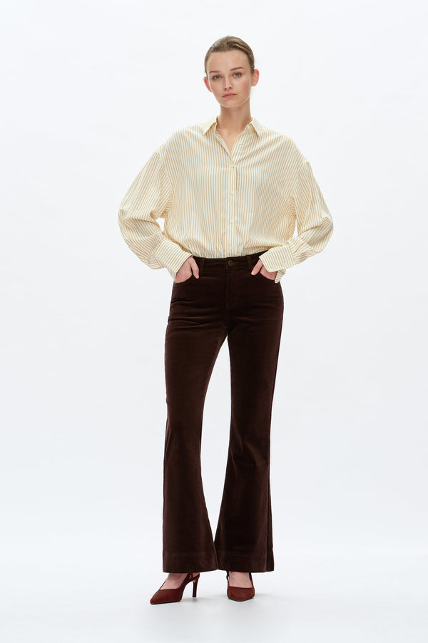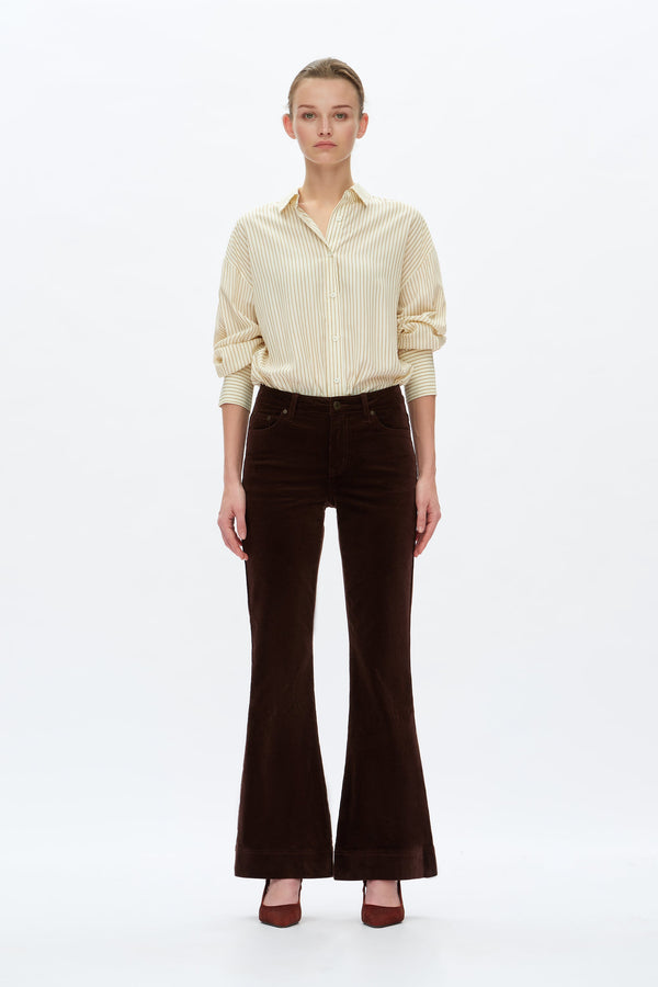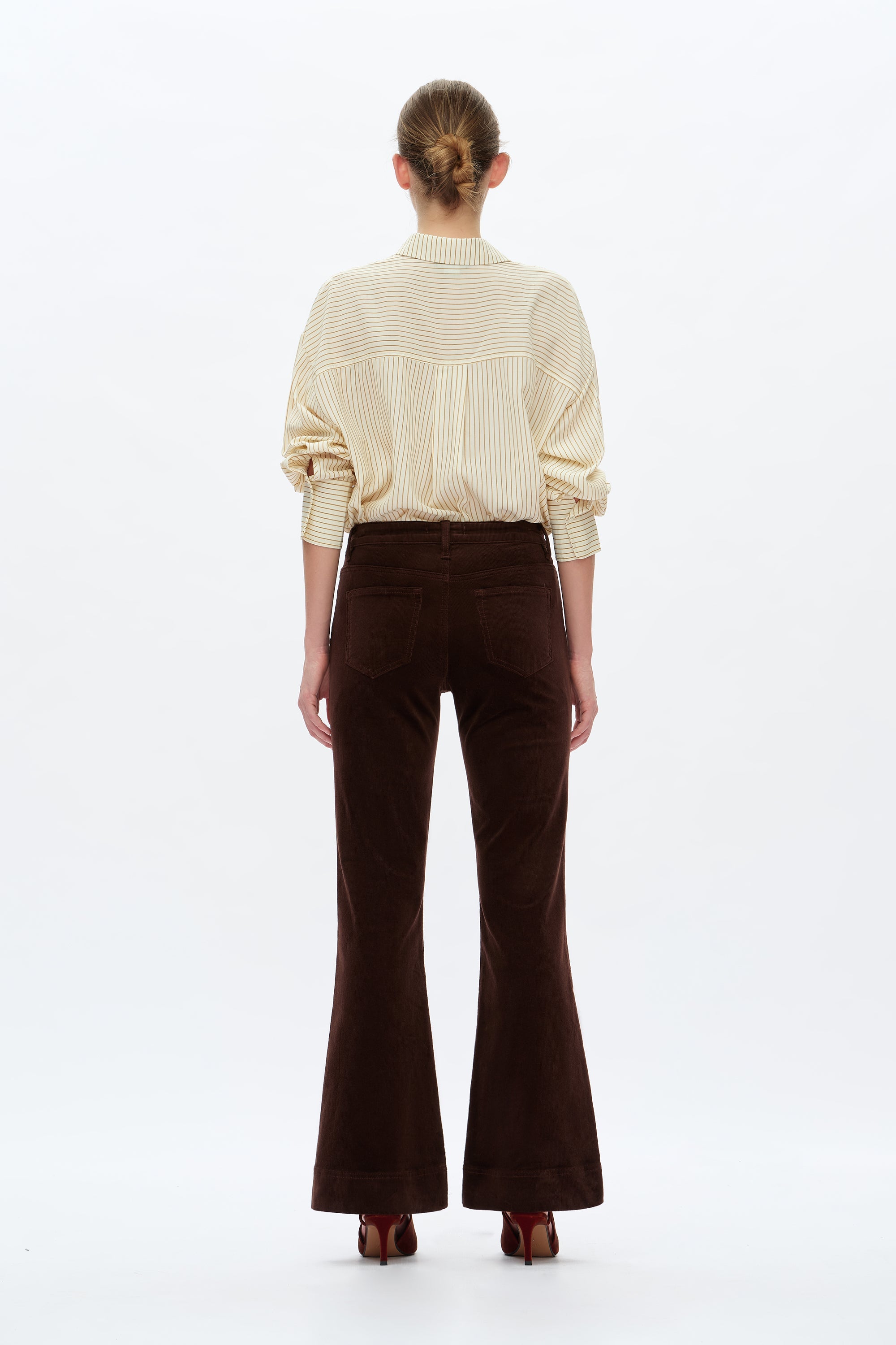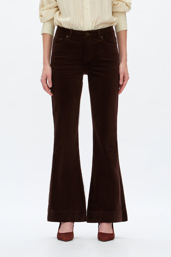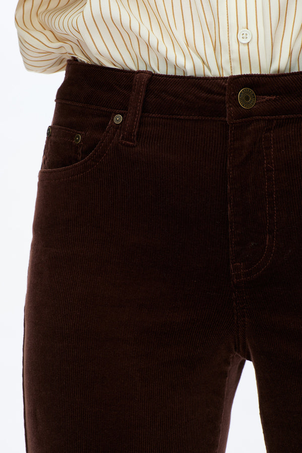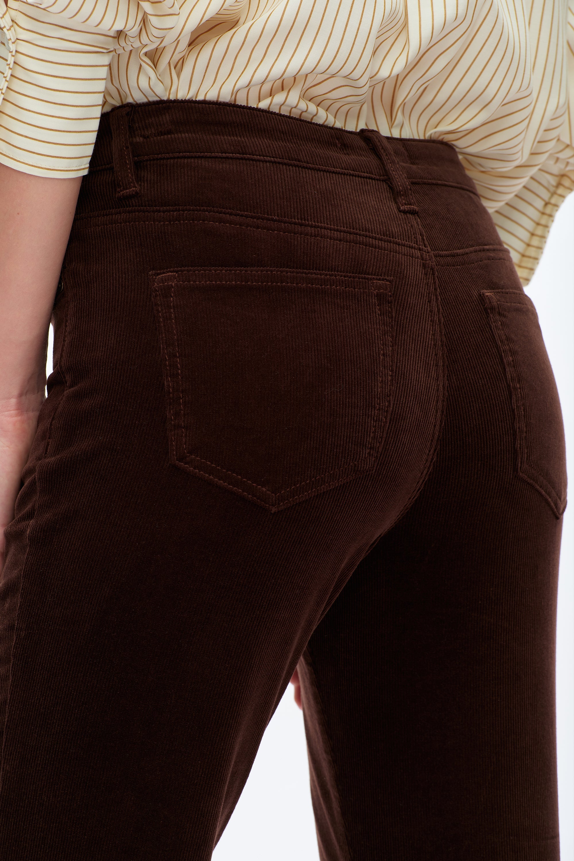 A modern flare cut with a comfortable mid-rise. These pants are made from soft corduroy in a dark brown color, creating a rich, textured look.