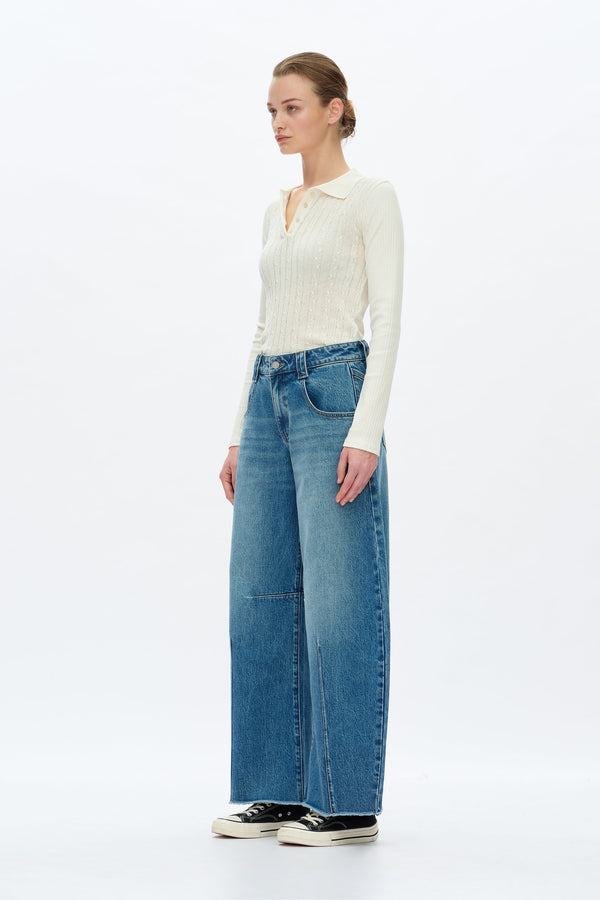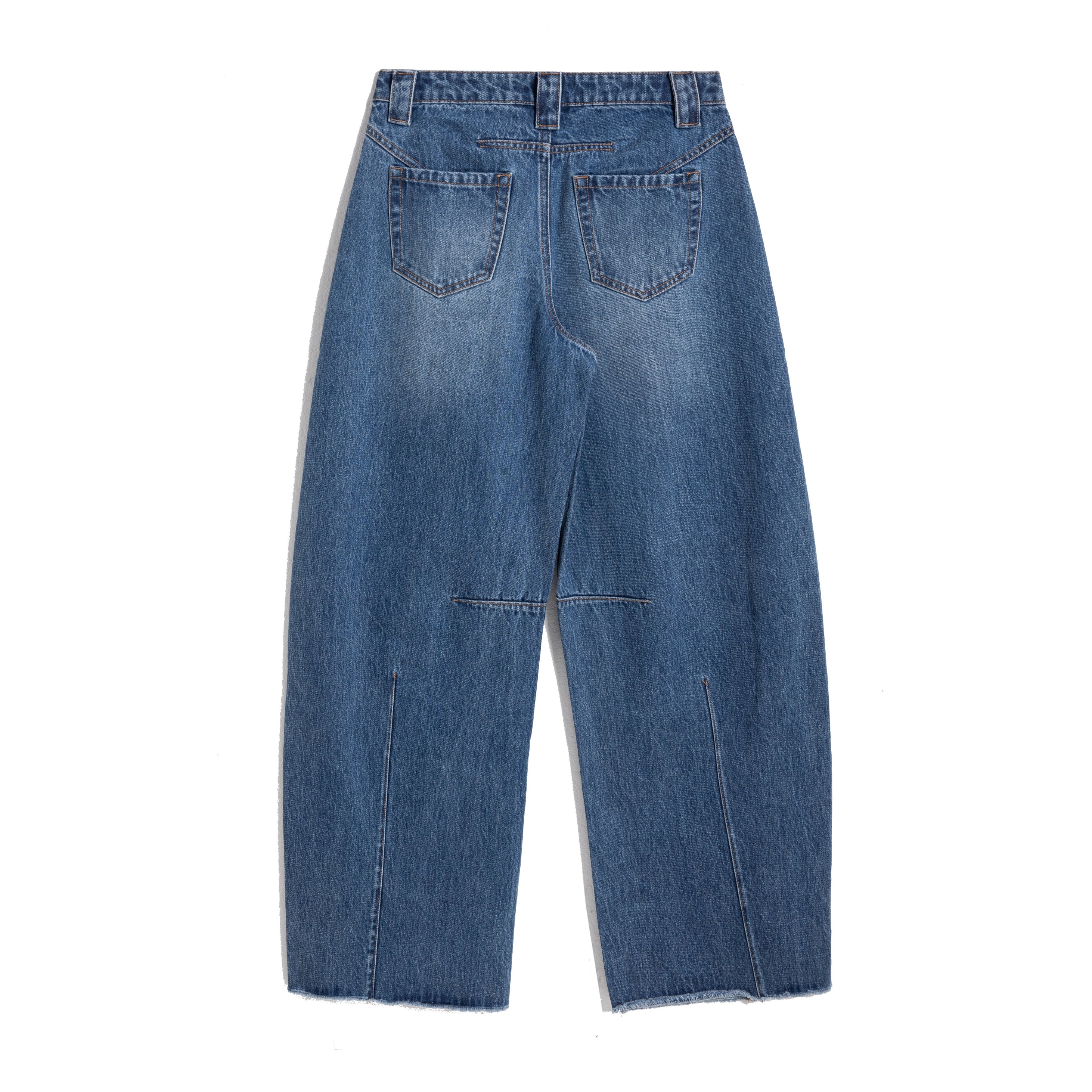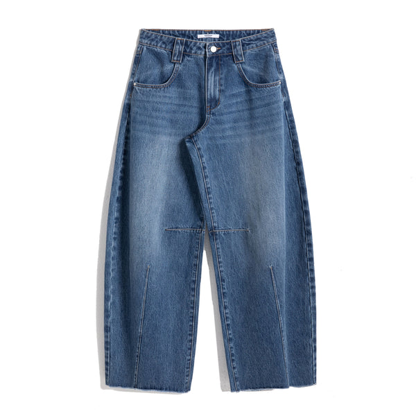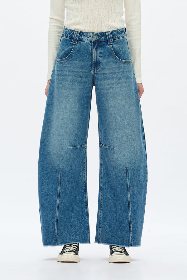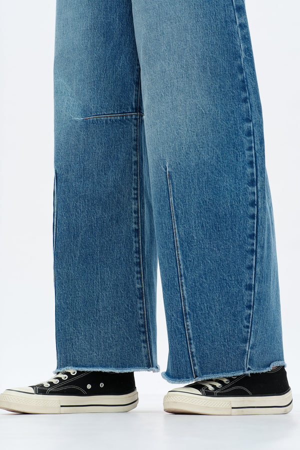 These jeans have a comfortable mid-rise and a wide, curved barrel leg. The design includes a front seam and a raw-edge hem, with a light-to-dark faded denim wash..