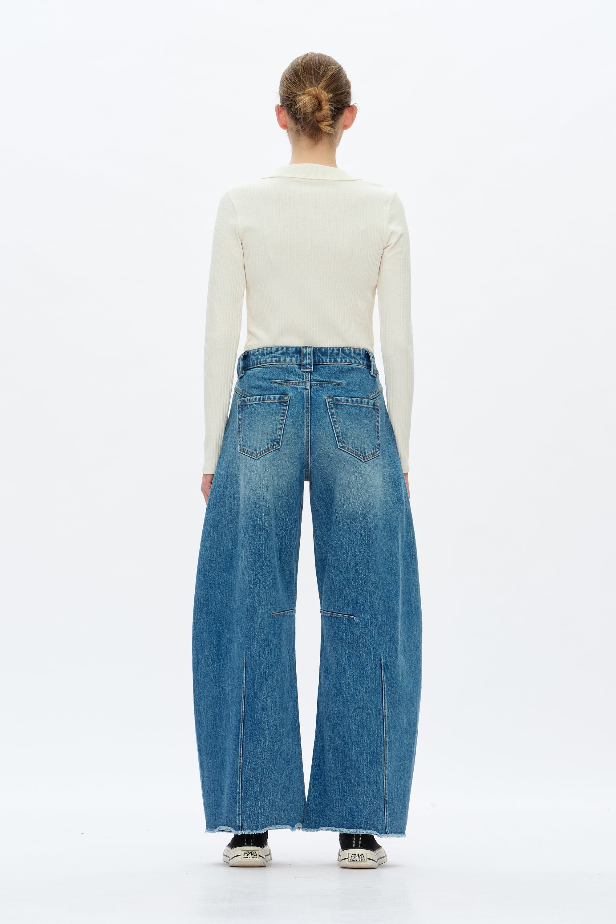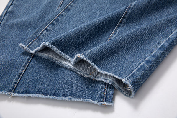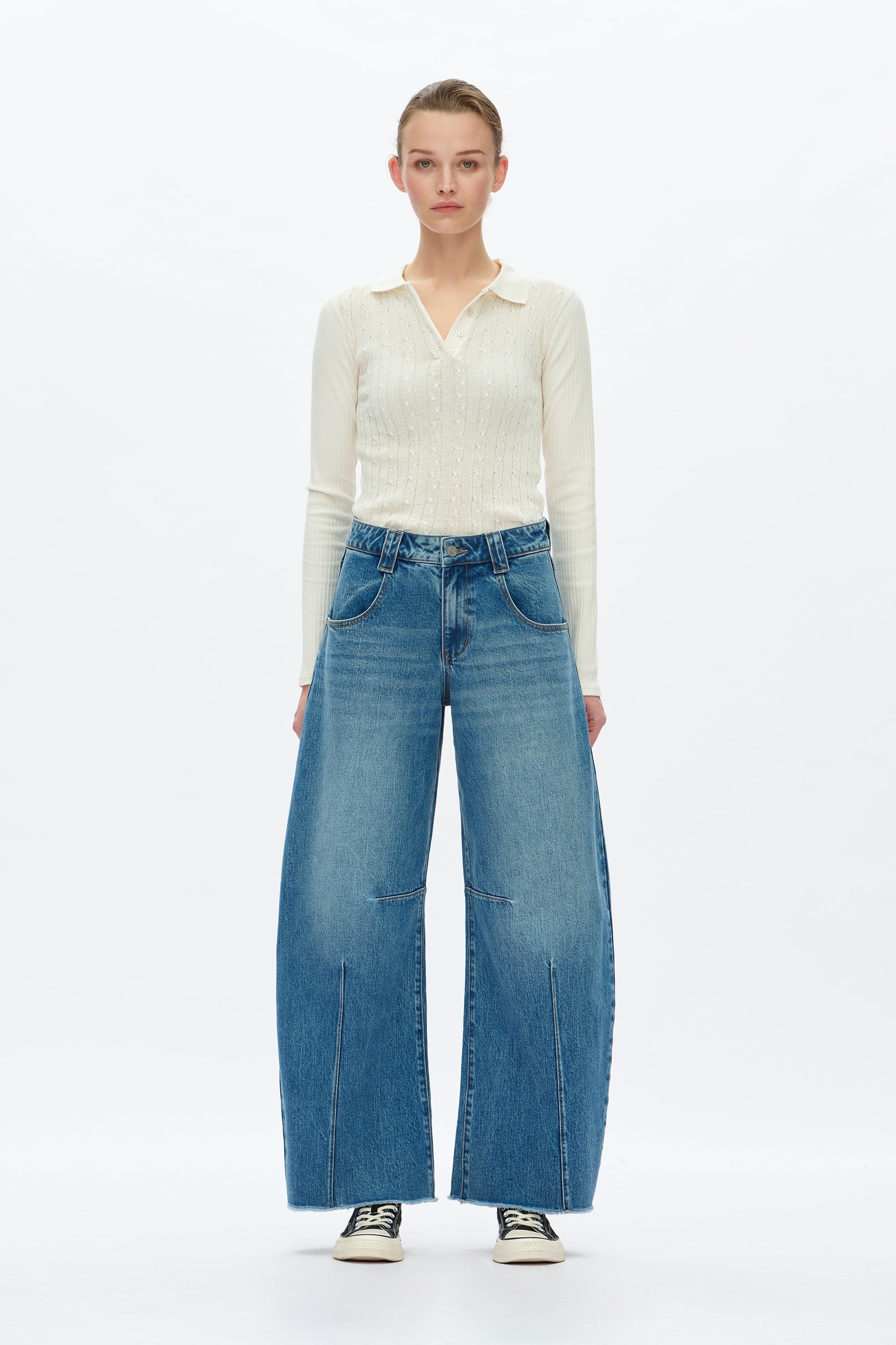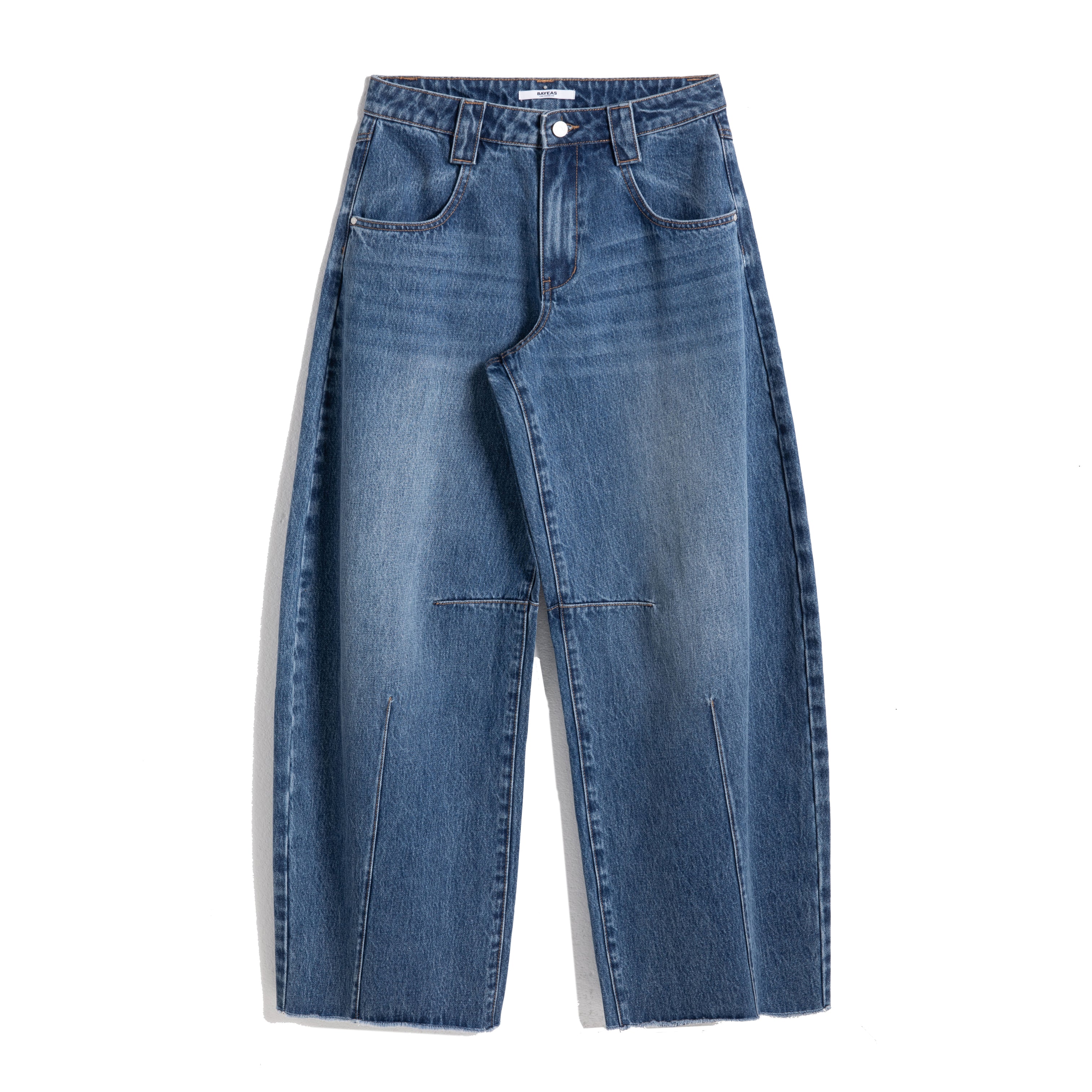 These jeans have a comfortable mid-rise and a wide, curved barrel leg. The design includes a front seam and a raw-edge hem, with a light-to-dark faded denim wash..