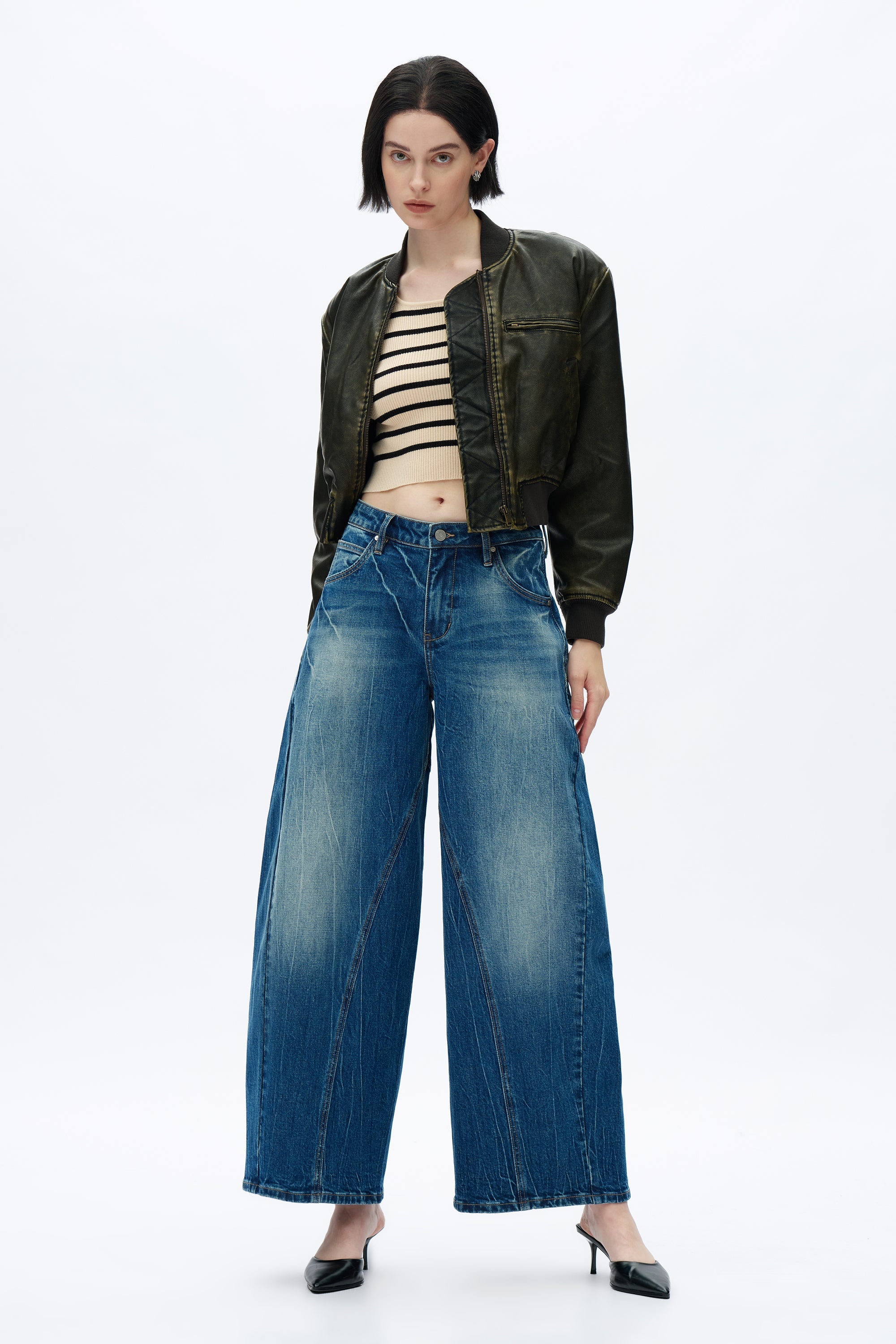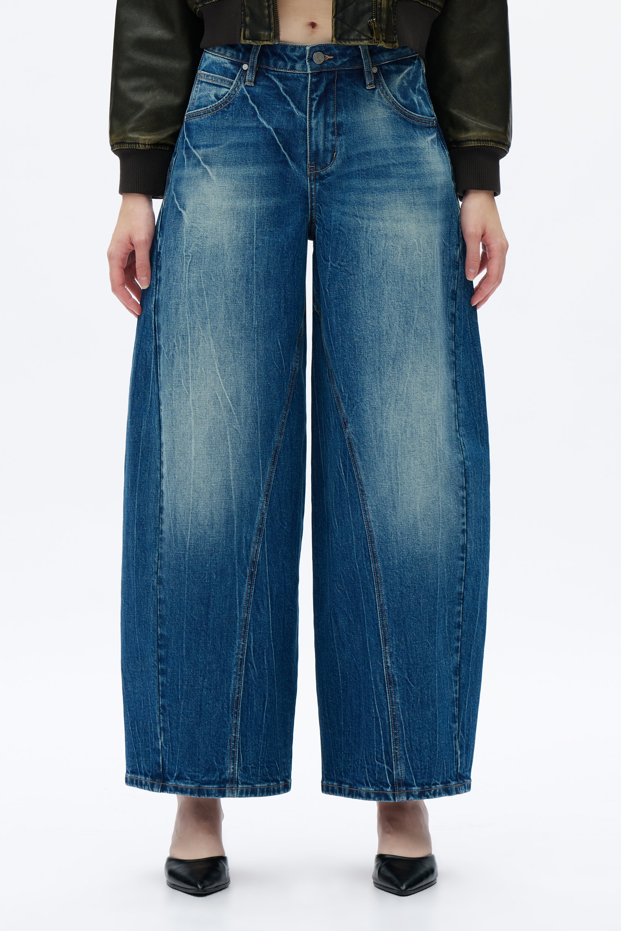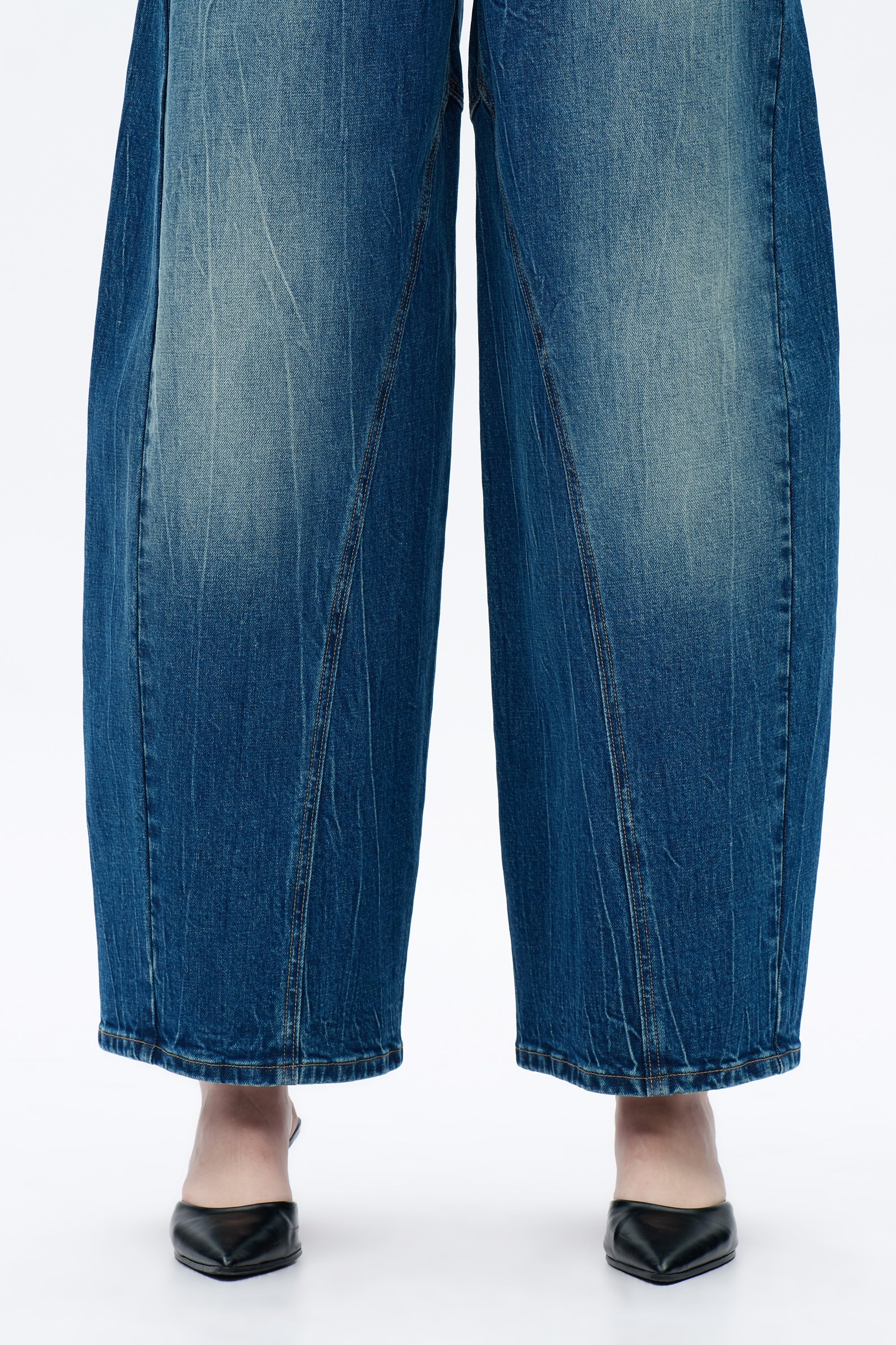 These women's mid-rise jeans feature a unique drop crotch and harem silhouette, blending a relaxed fit with a bold, fashion-forward design. The curved seams and distressed finish add a modern, edgy touch.