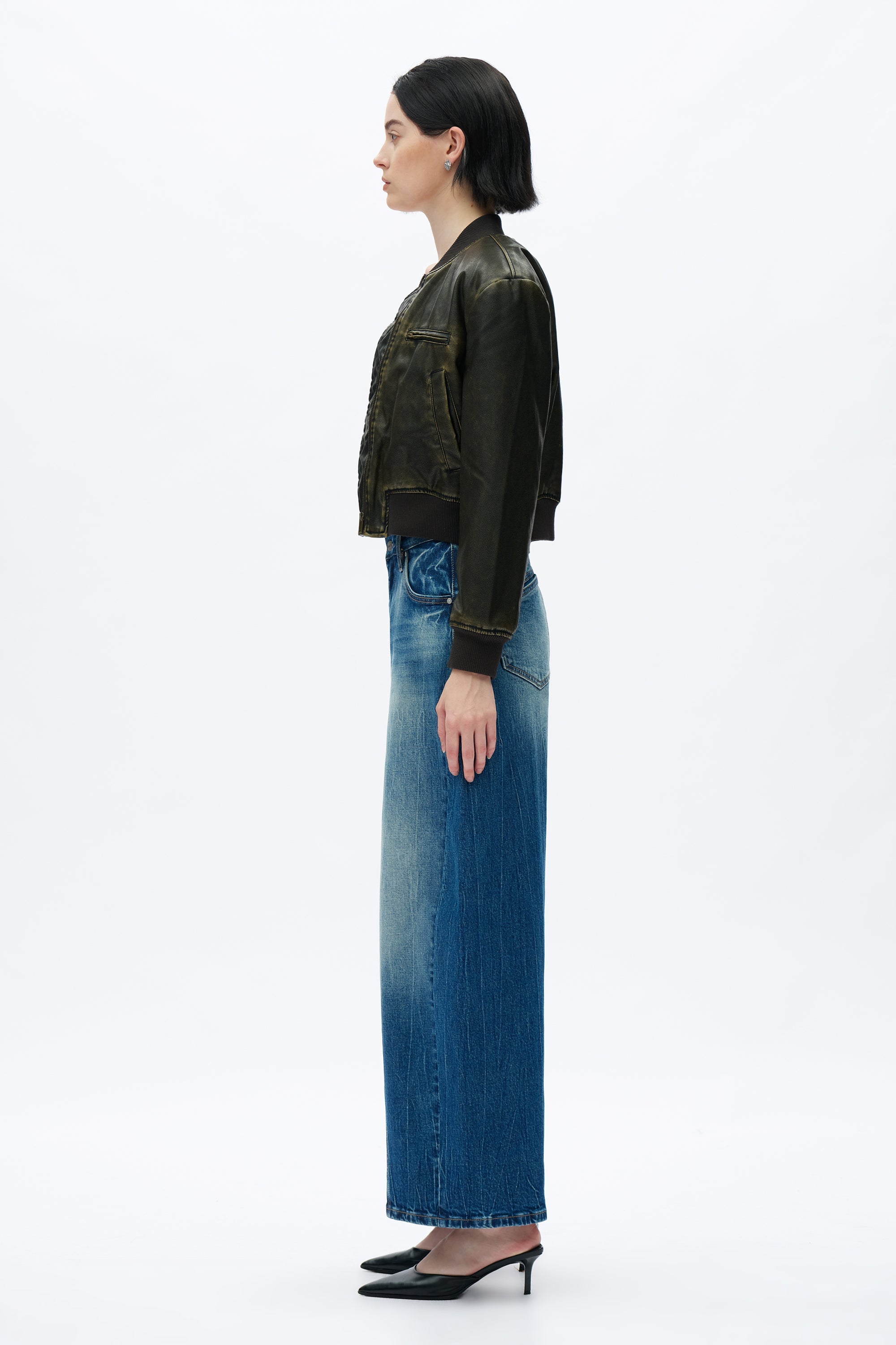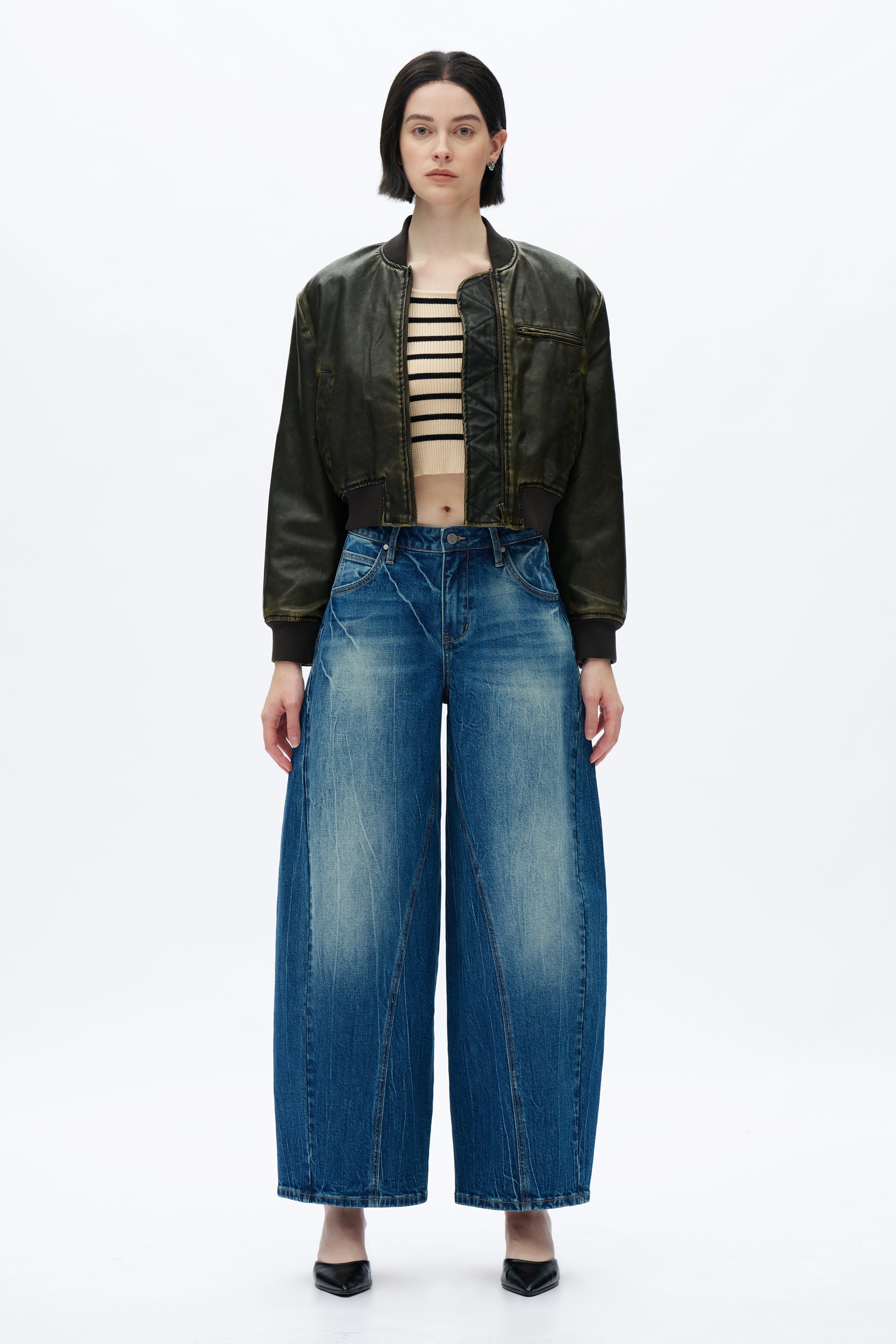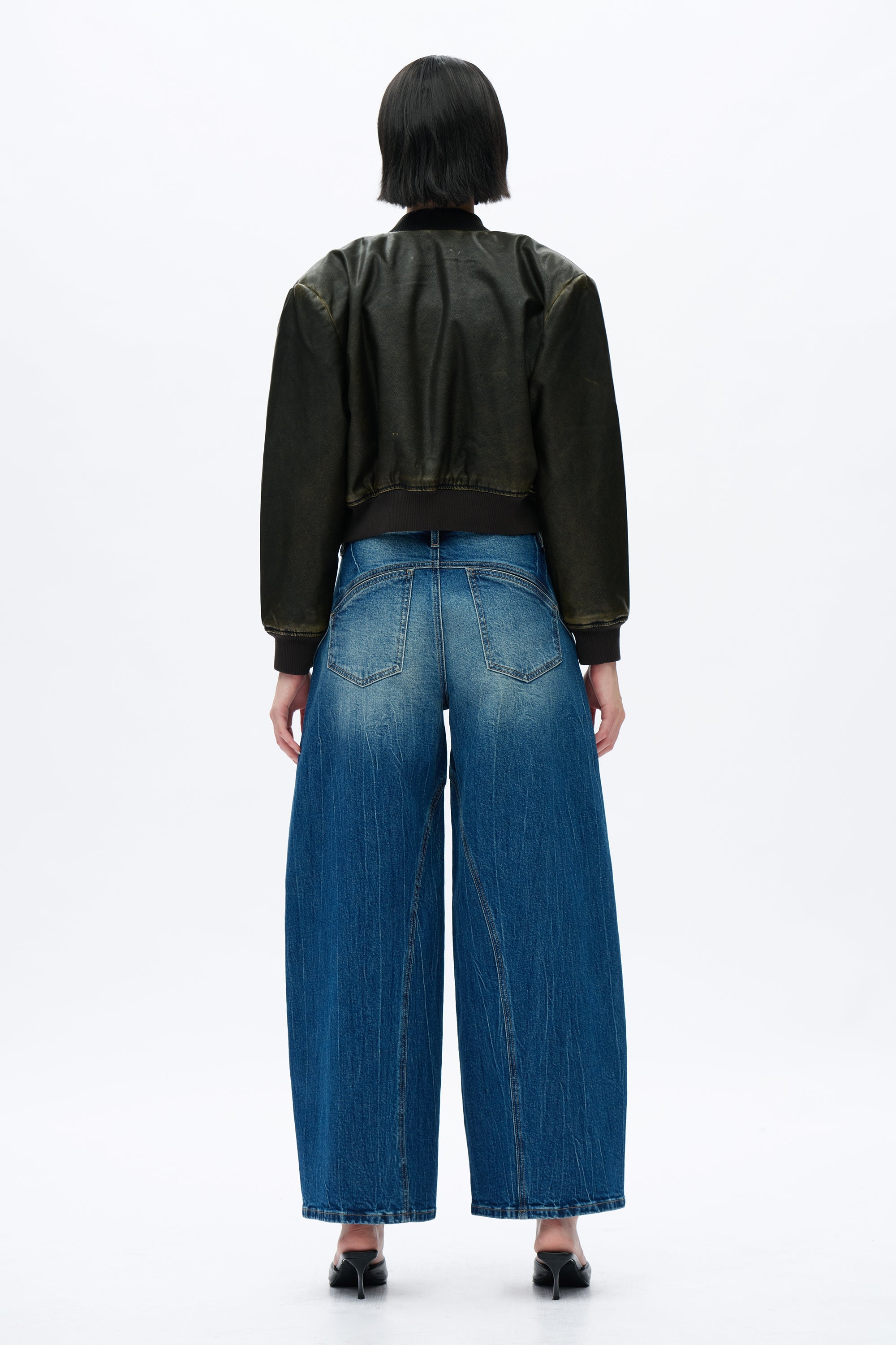 These women's mid-rise jeans feature a unique drop crotch and harem silhouette, blending a relaxed fit with a bold, fashion-forward design. The curved seams and distressed finish add a modern, edgy touch.