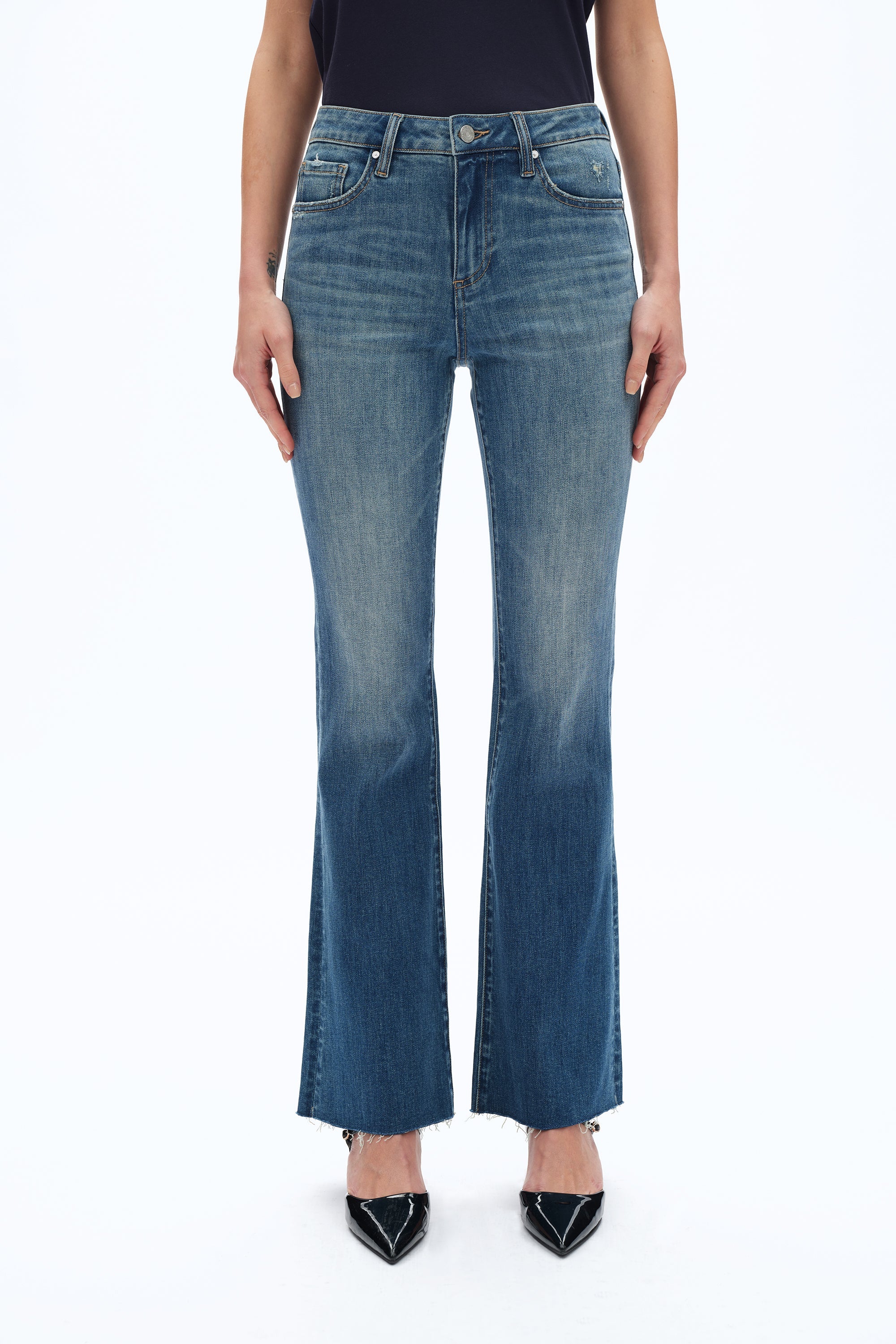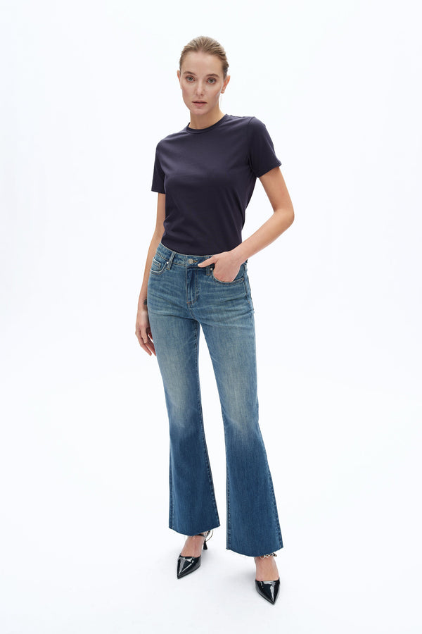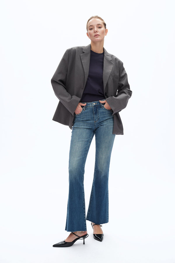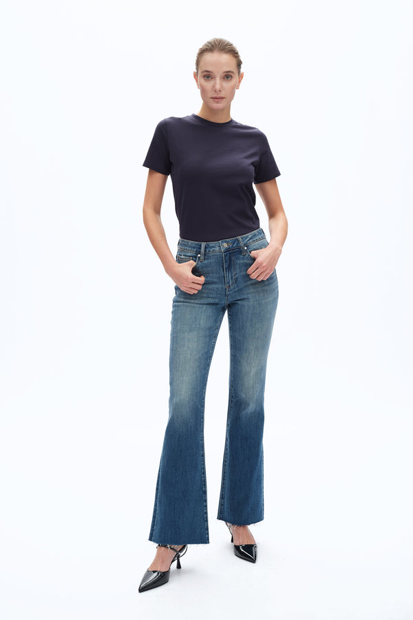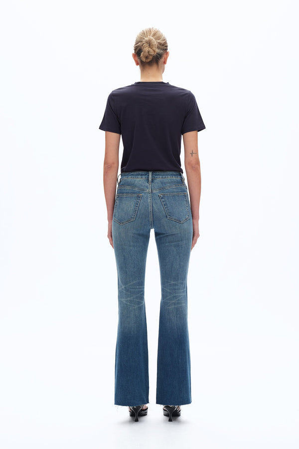 A modern flare silhouette with a mid-rise waist. The light blue wash on the thighs fades into a darker tone at the hem, which is finished with a frayed edge.