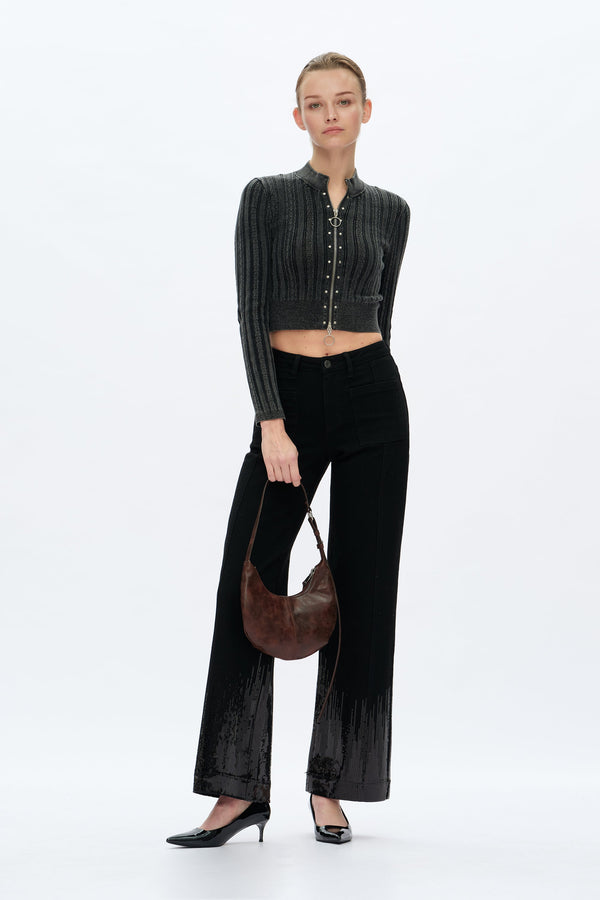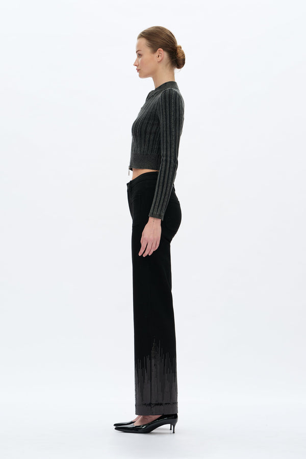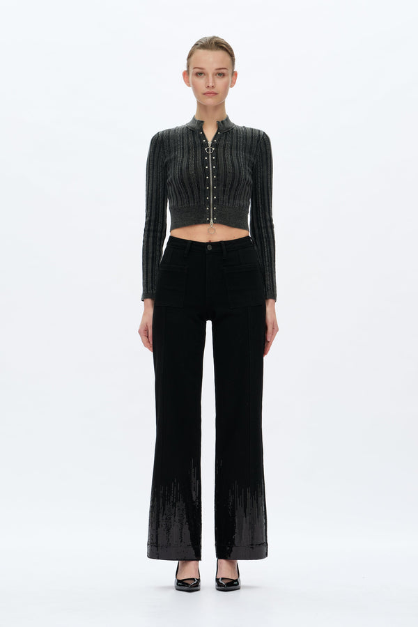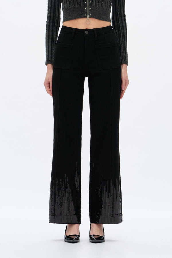 High rise sequin wide leg jeans with a black wash, featuring sequin embroidery at the hems. The front includes two square pockets, enhancing leg shape and lengthening the appearance of the legs.