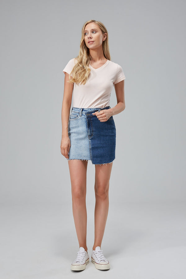 Add an edgy touch to your style with this mid-rise skirt. The eye-catching two-tone design, raw hem, and comfortable fit are perfect for standing out from the crowd.
