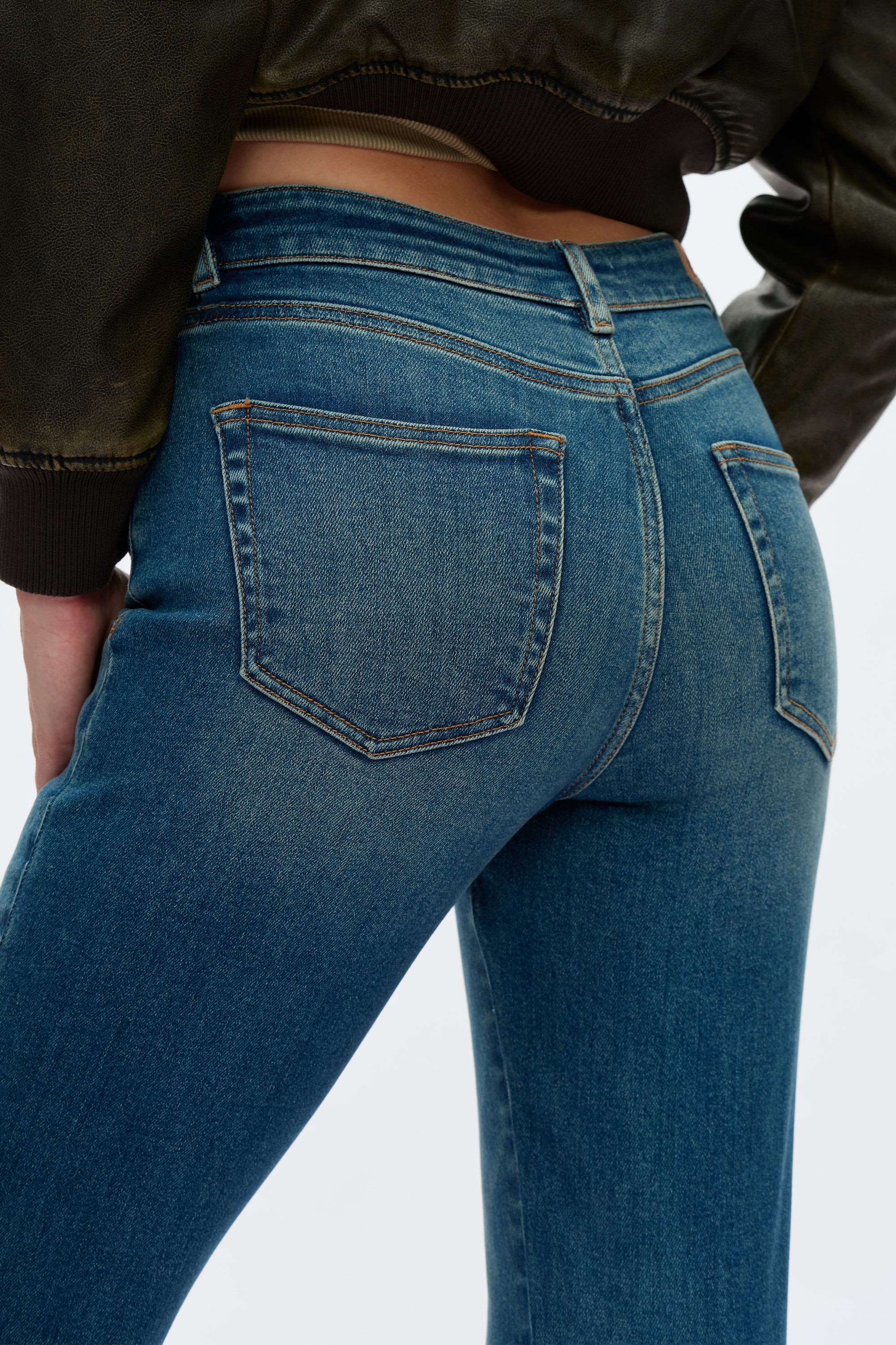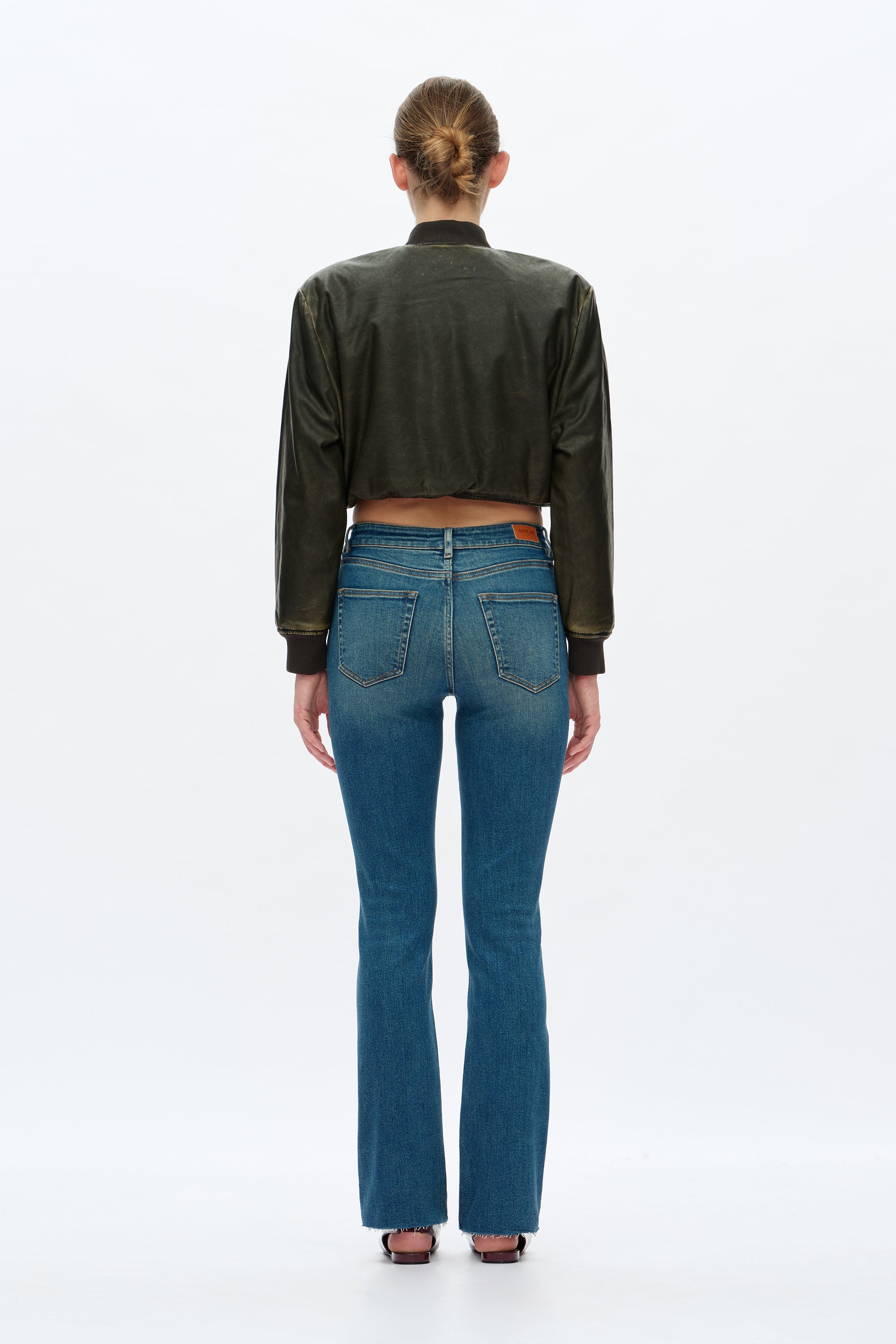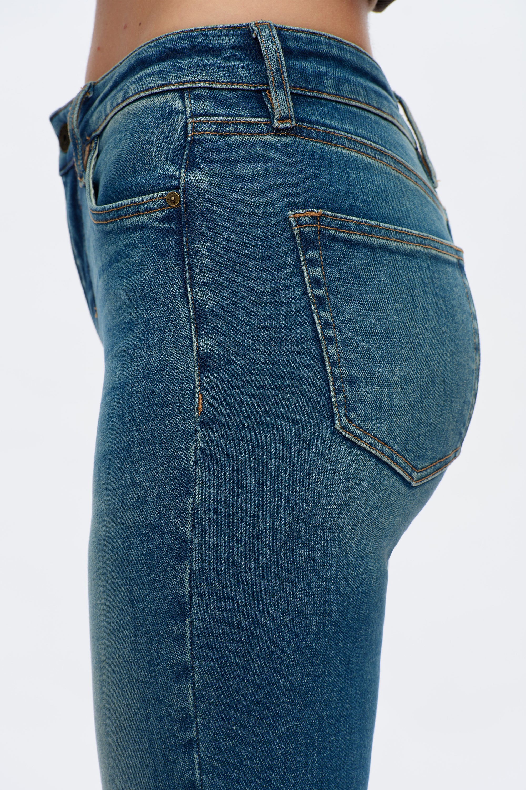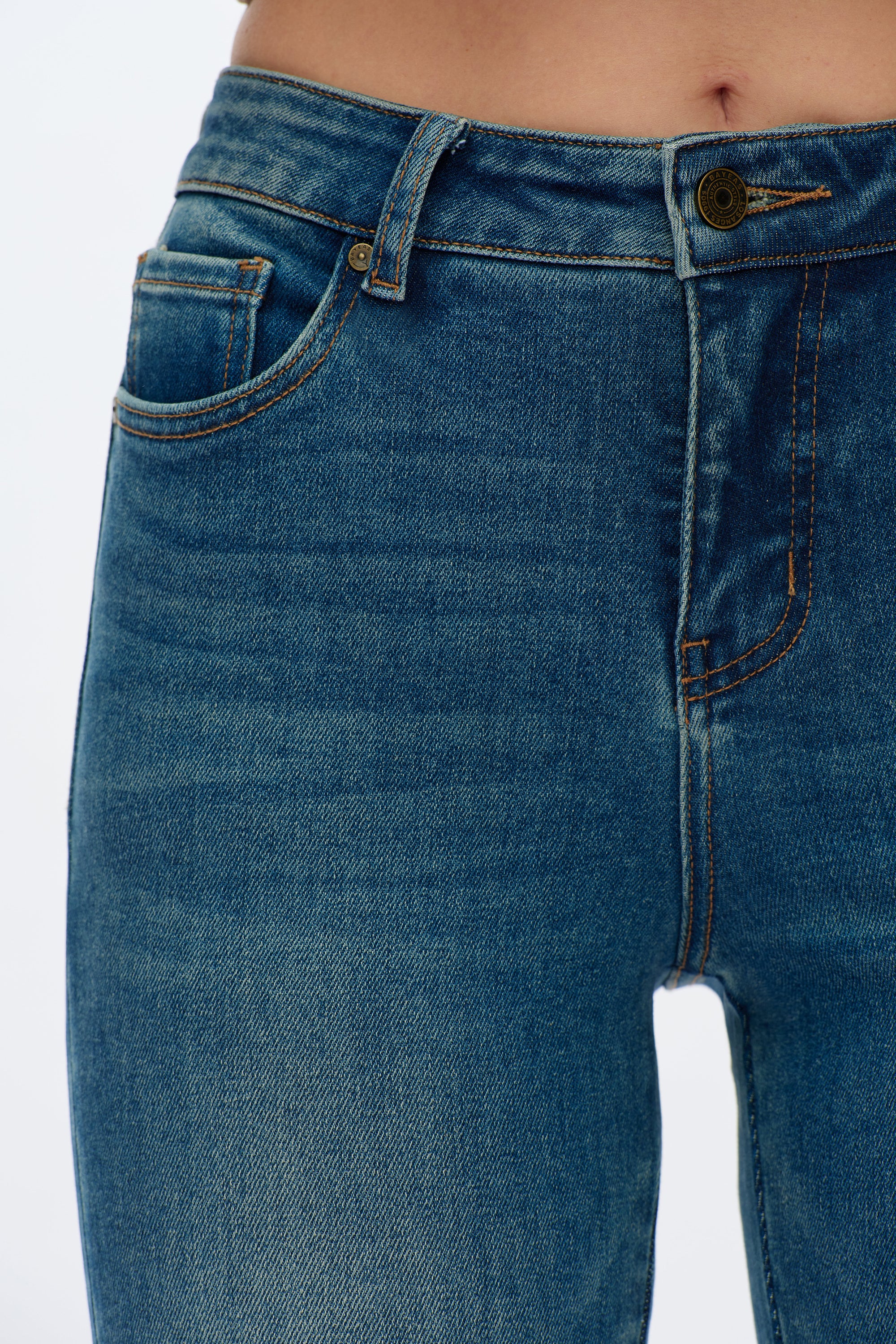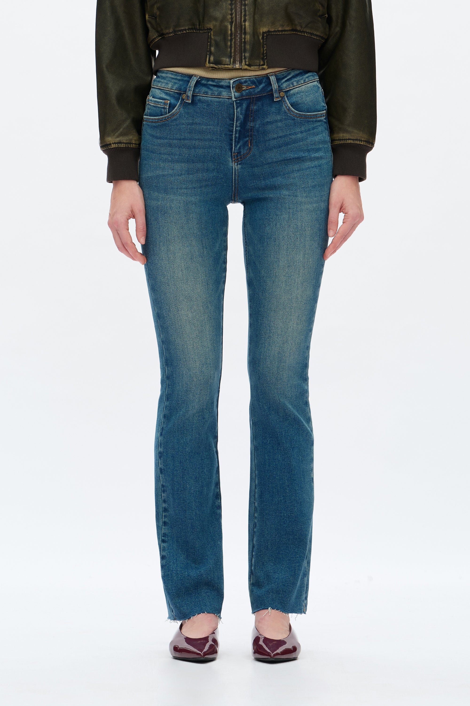 Mid rise slim straight jeans, light blue water washing, with conventional cats and handmade fading processes in the front.
