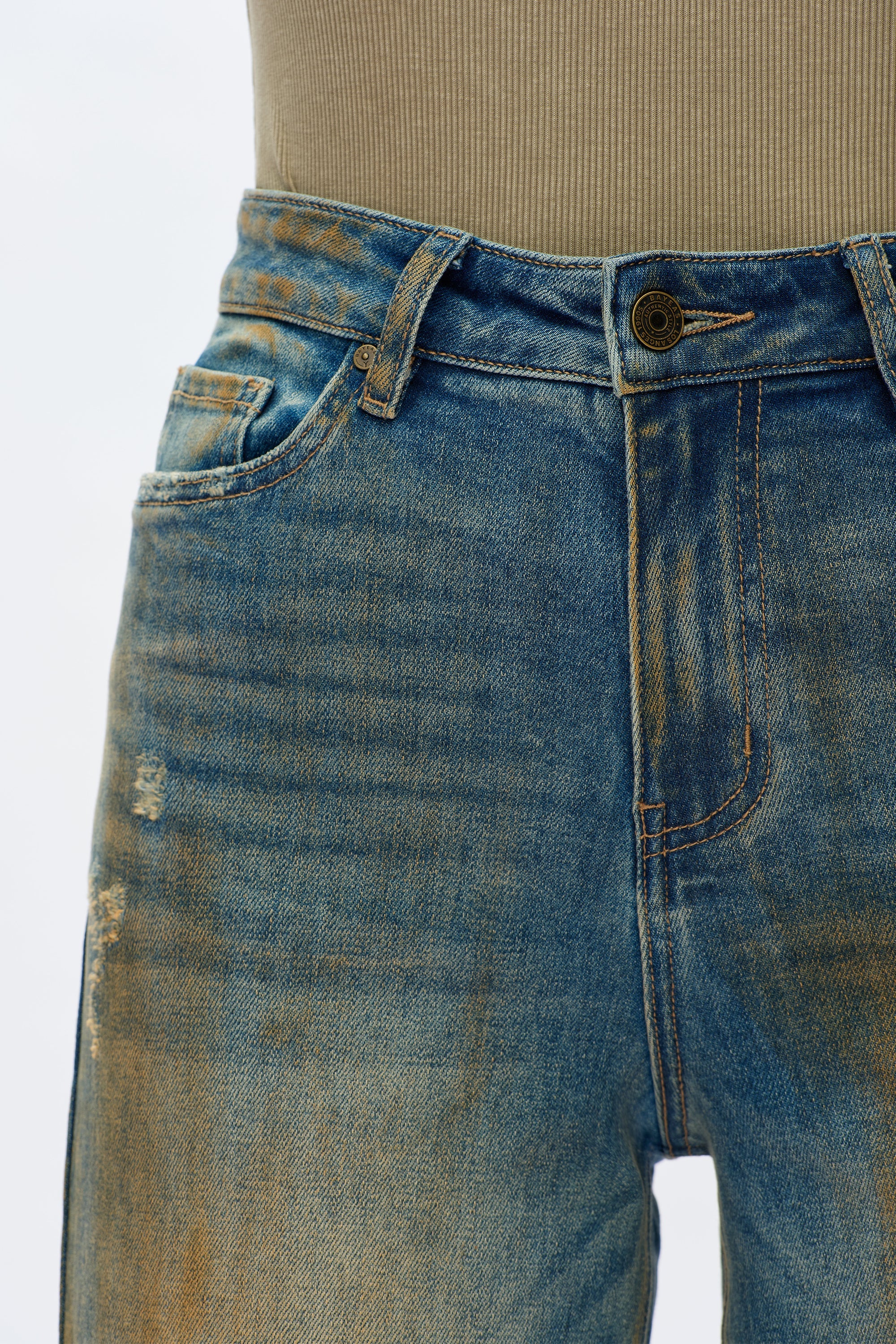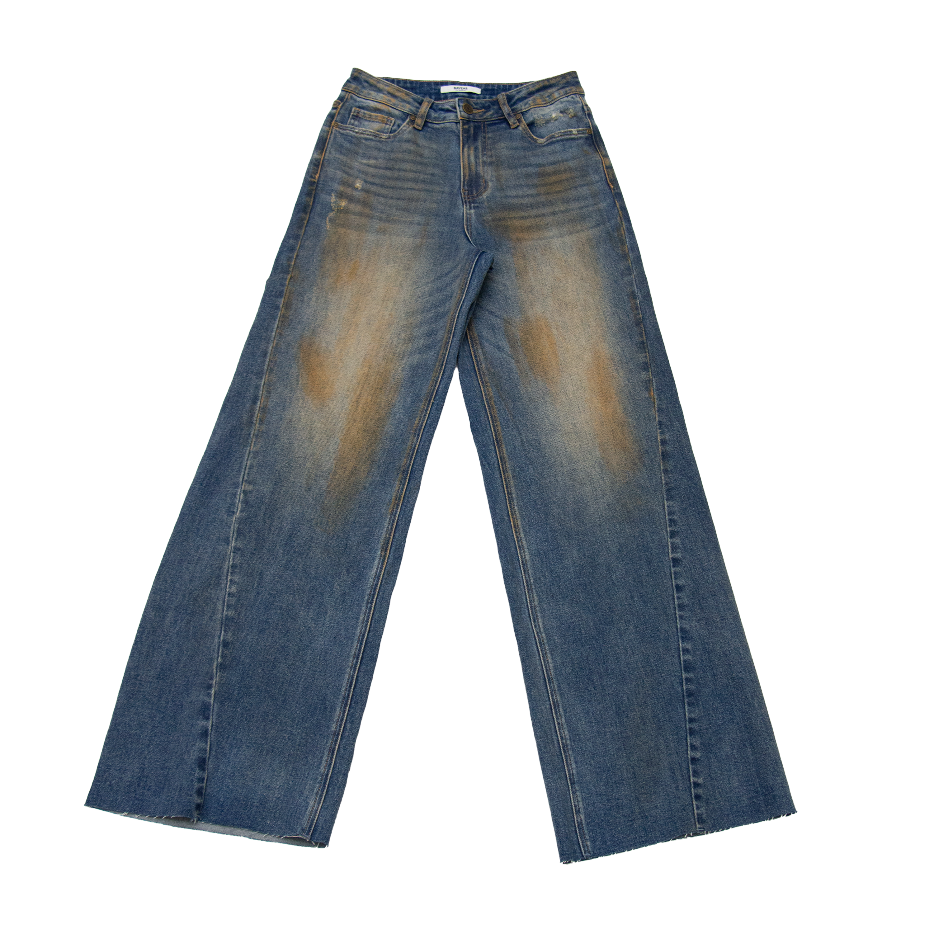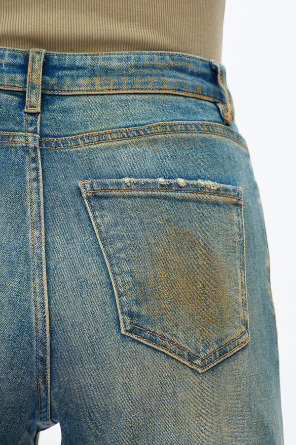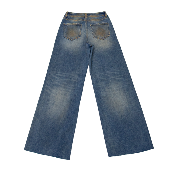 Mid rise vintage wide leg jeans with five-pocket design in medium blue wash, featuring distressed mud-dye finish. Both front and back pockets have hand-distressed detailing, with whiskering and sandblast effects on the front and back panels.