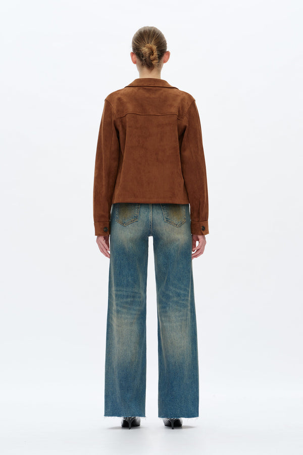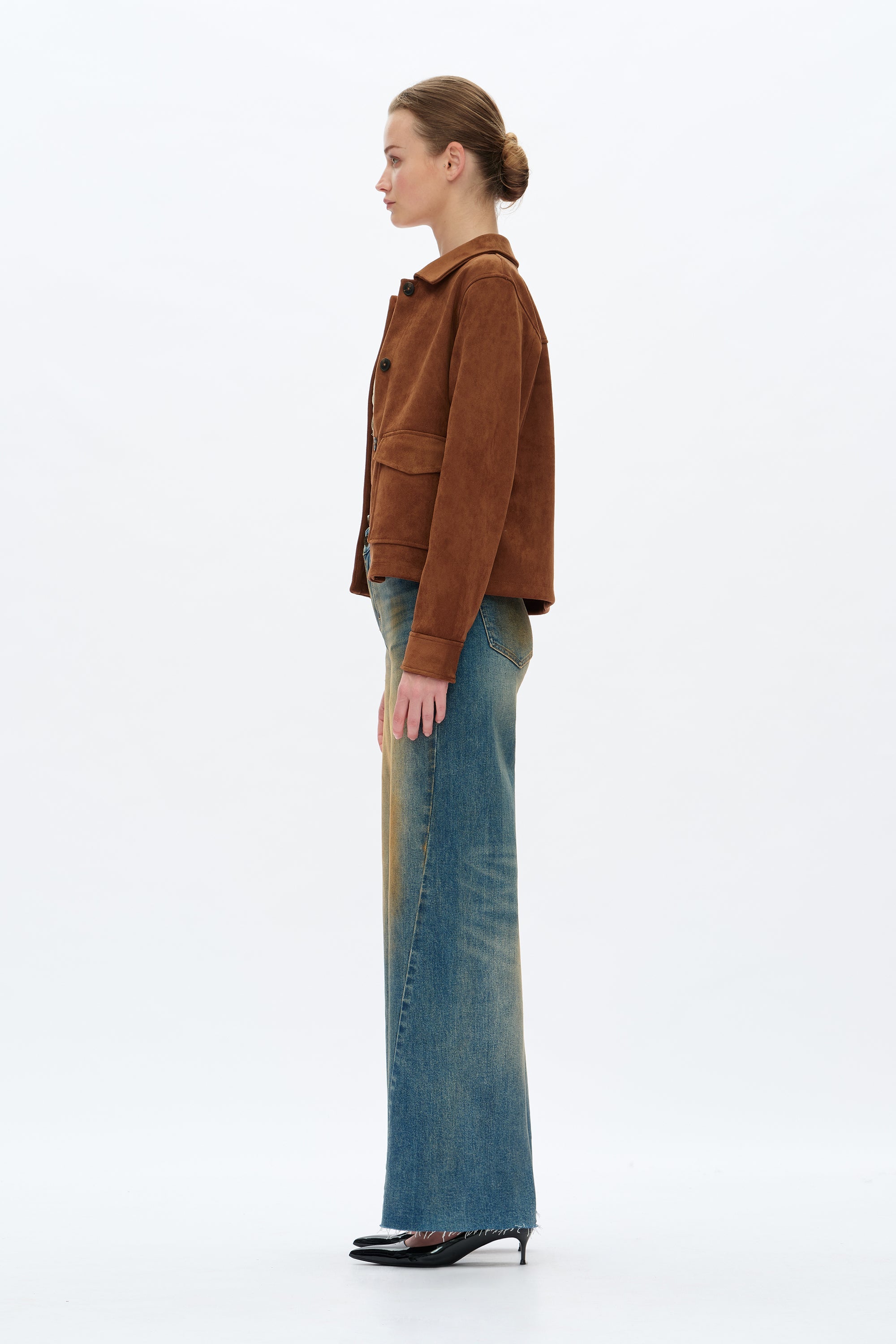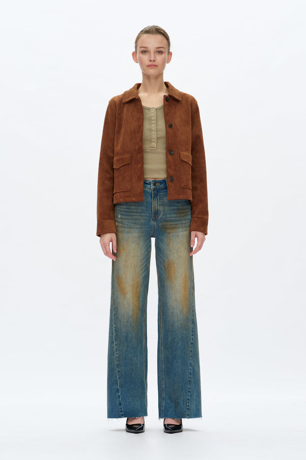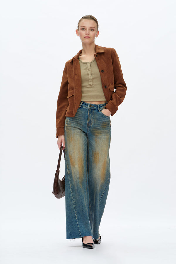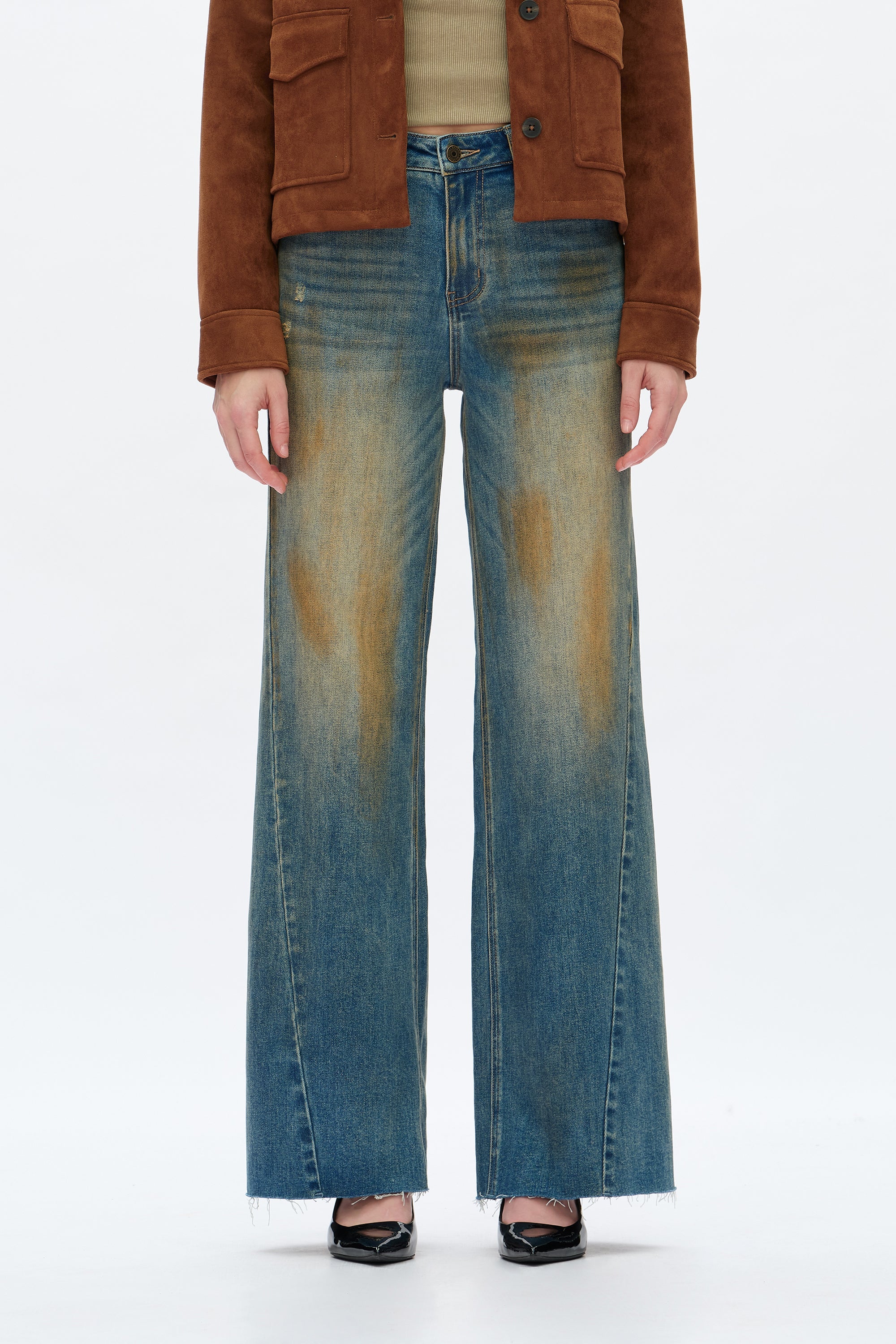 Mid rise vintage wide leg jeans with five-pocket design in medium blue wash, featuring distressed mud-dye finish. Both front and back pockets have hand-distressed detailing, with whiskering and sandblast effects on the front and back panels.