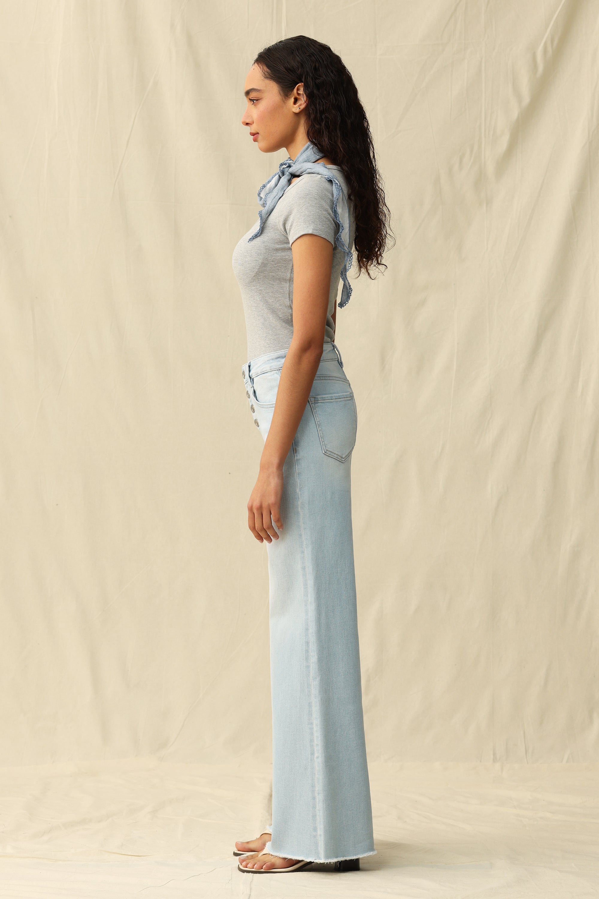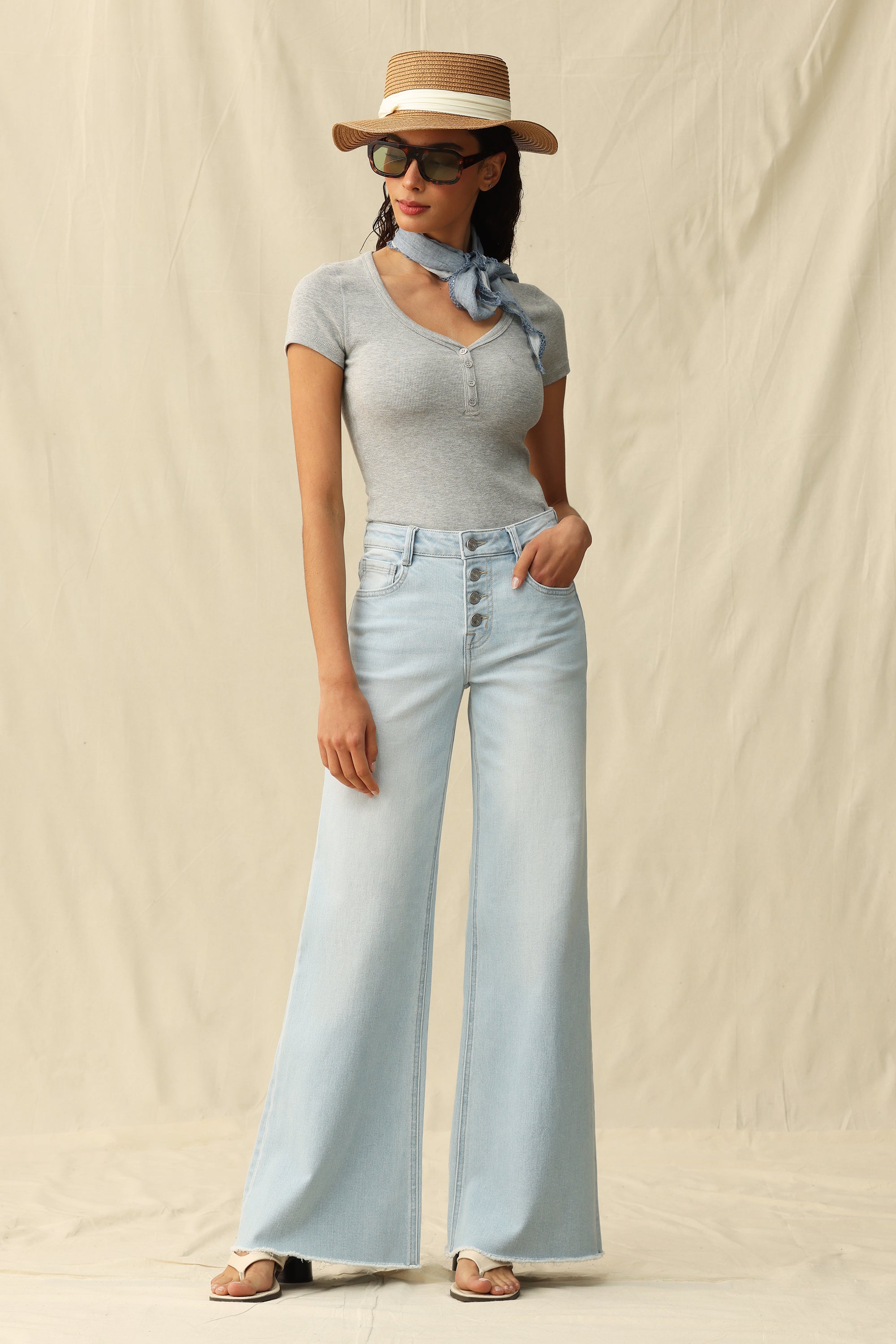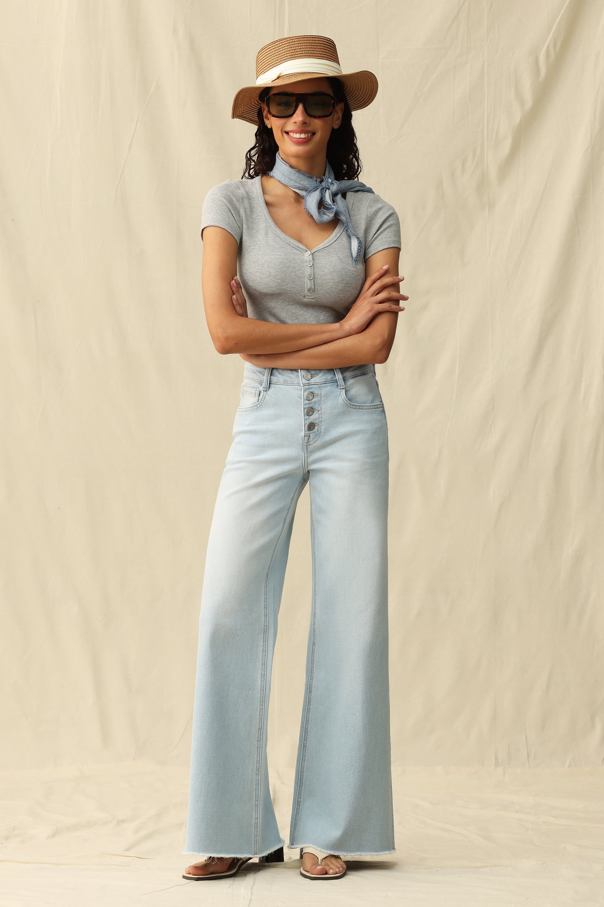 Stylish mid-rise wide-leg jeans crafted from premium stretch denim. Featuring a button fly, 5 pockets, authentic whiskering, hand-distressed details, and a raw hem. Perfect for both comfort and style.