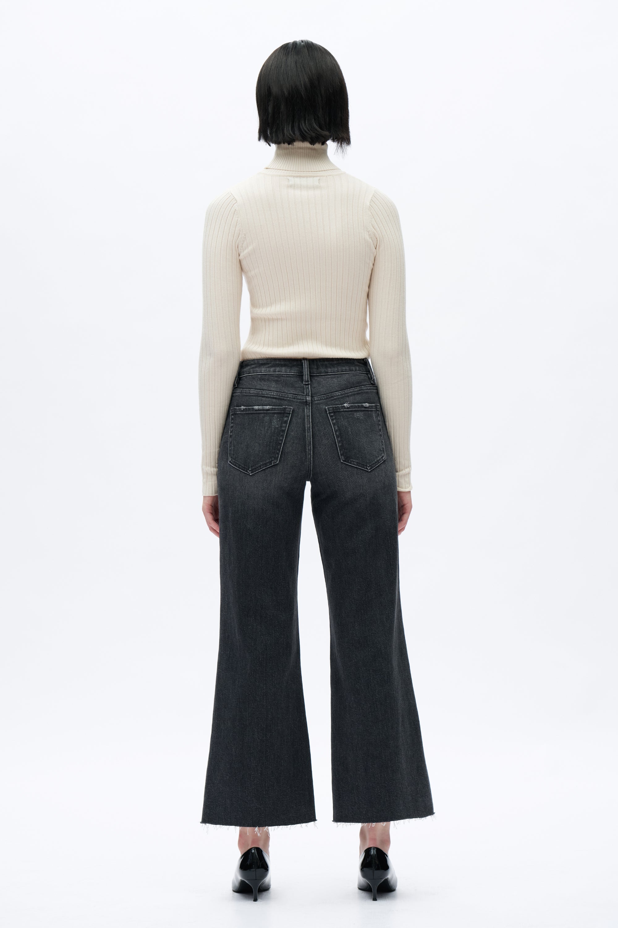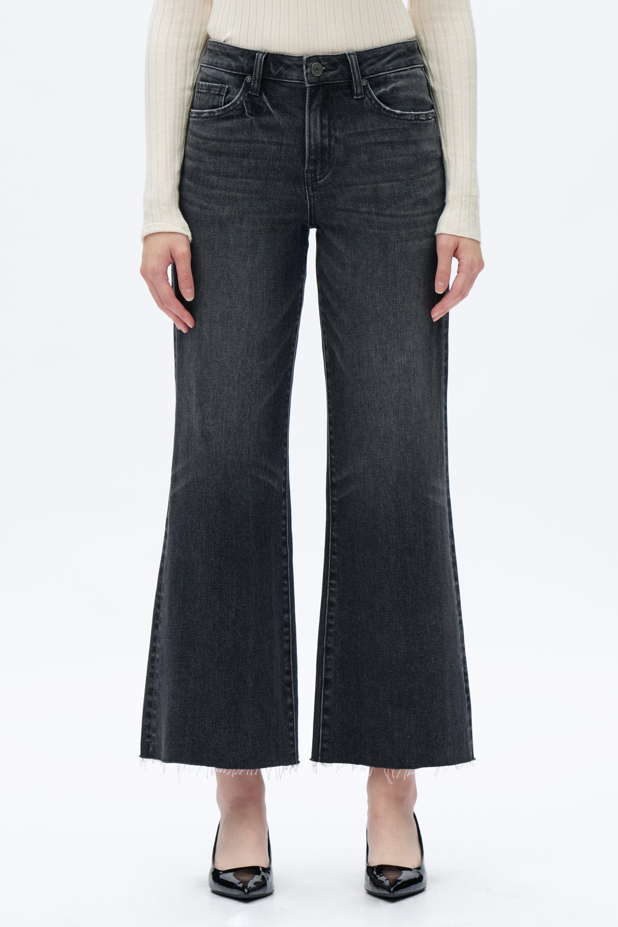 These jeans feature a mid-rise fit and a relaxed wide leg that ends in a raw, frayed hem. The dark black wash has a subtle, worn-in fade.