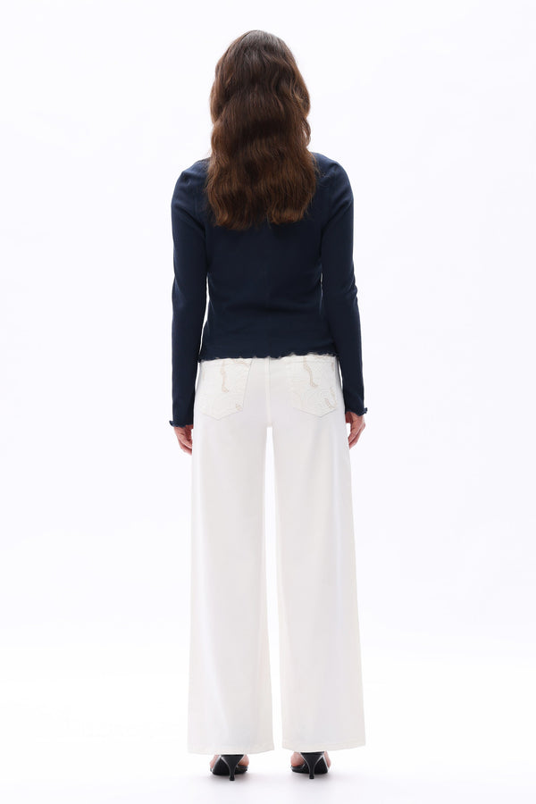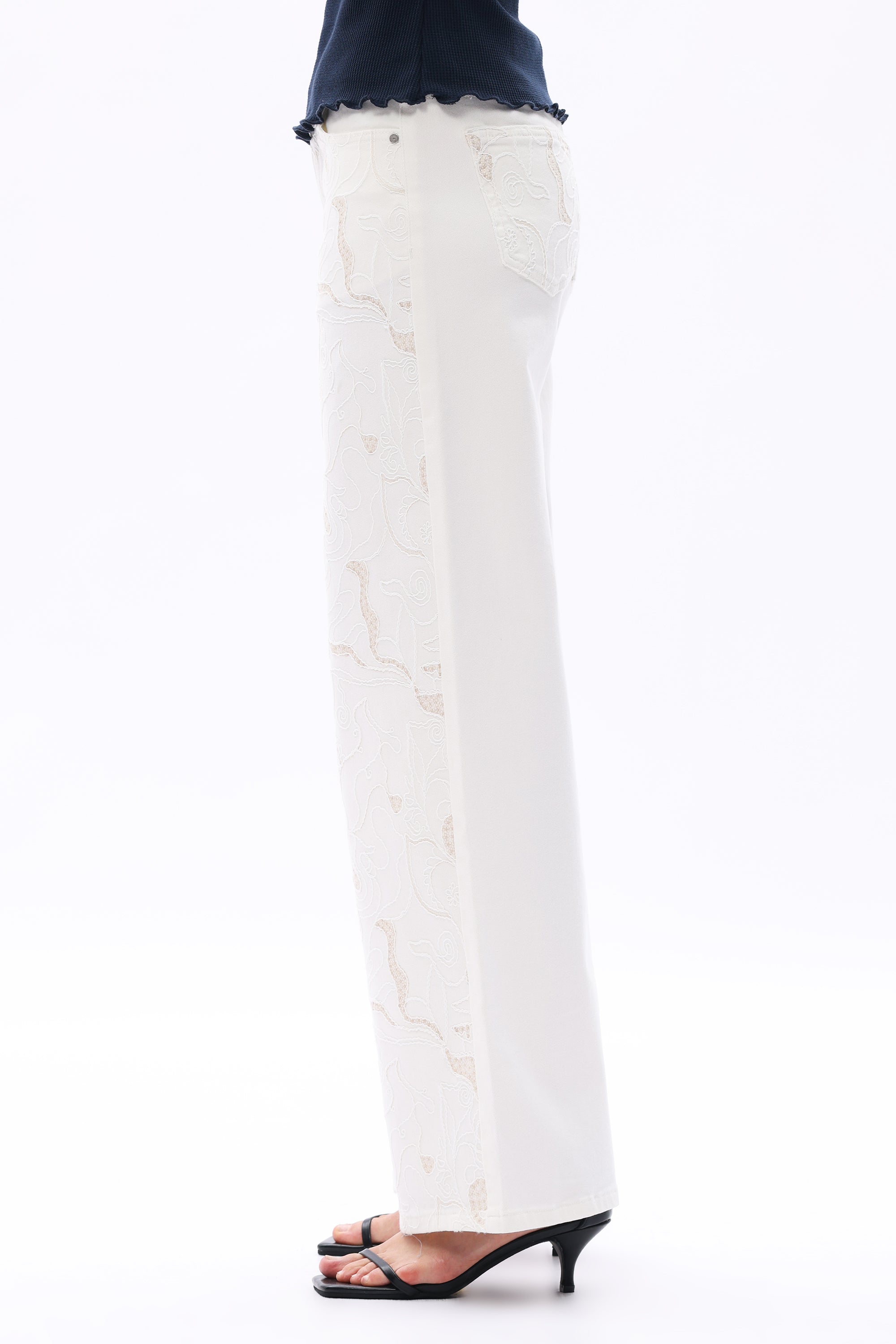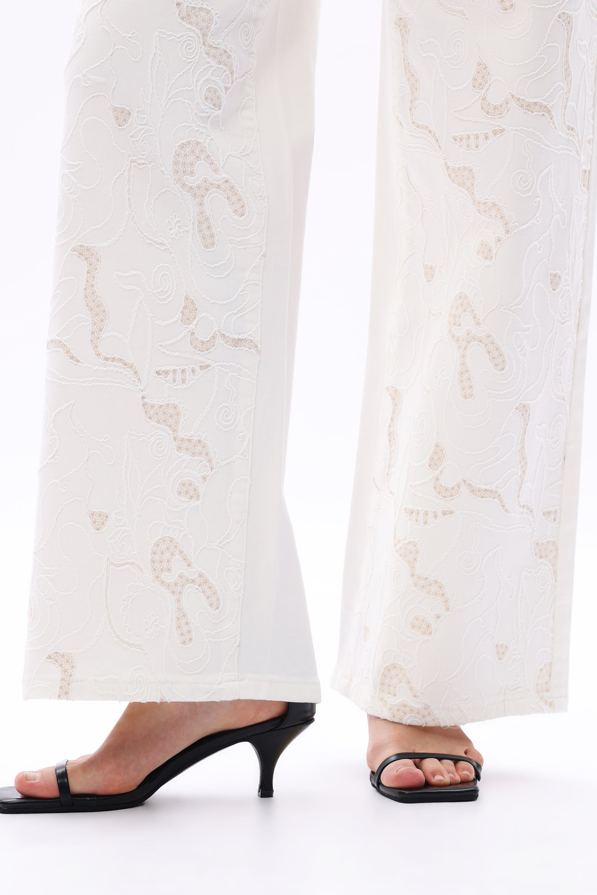 Mid-rise white lace wide-leg pants featuring delicate embroidered patterns and a relaxed, elegant fit.