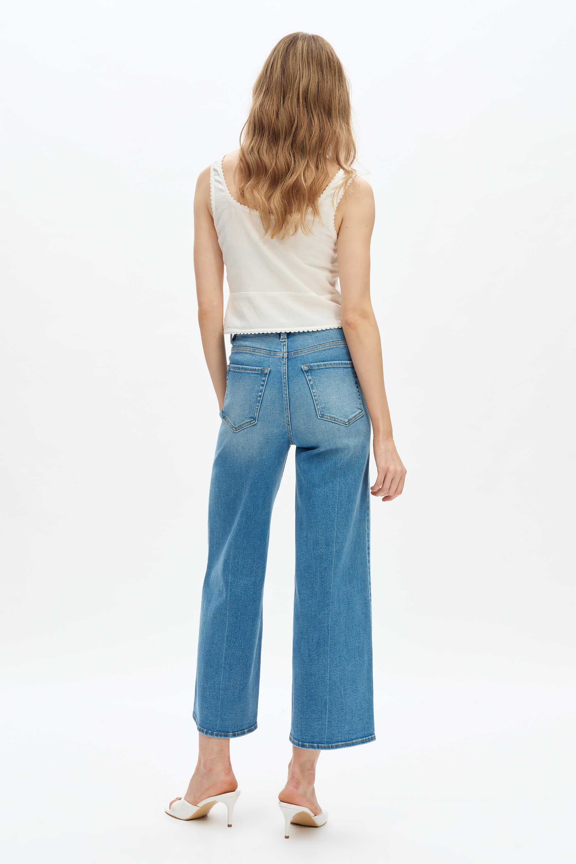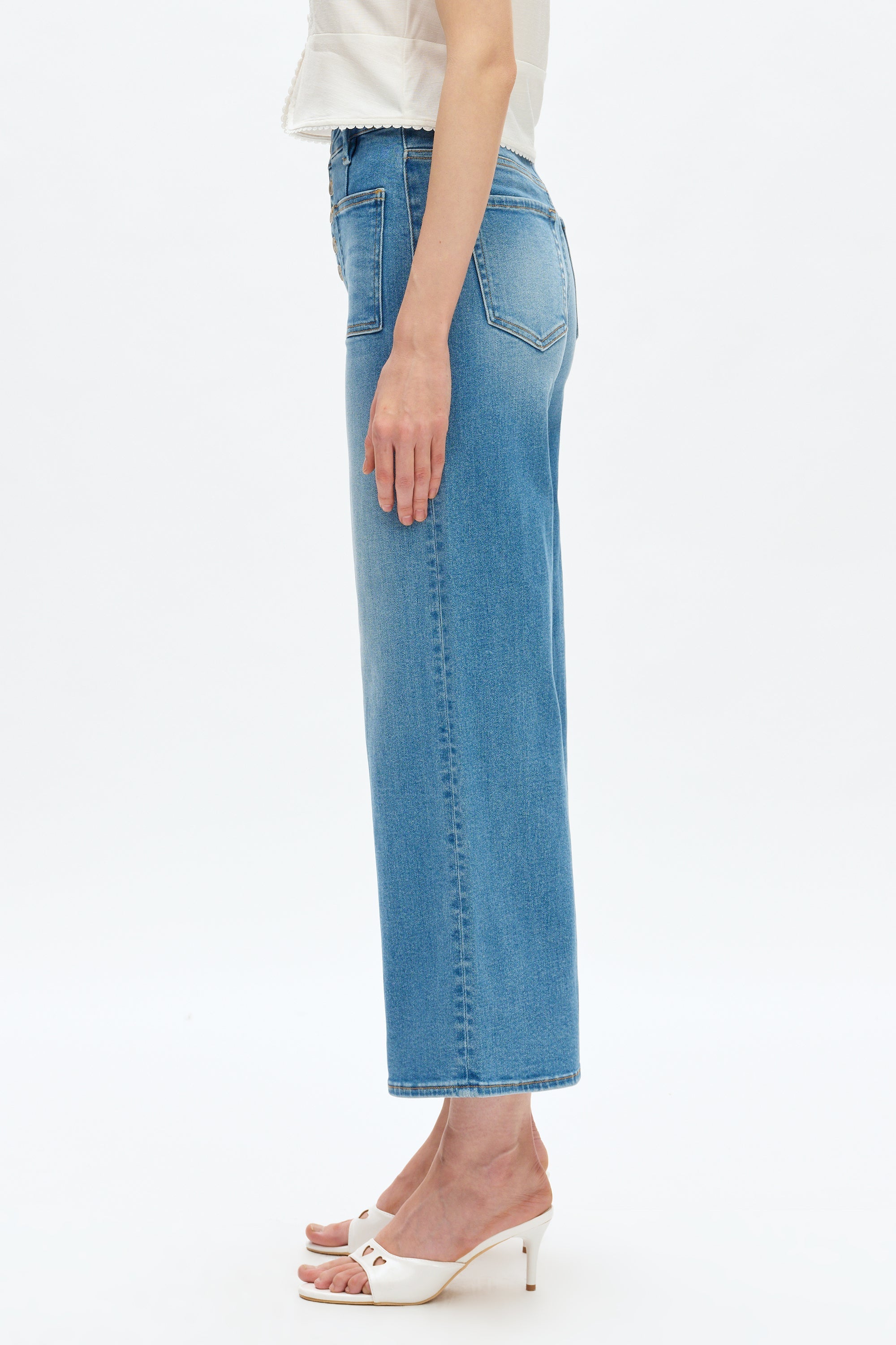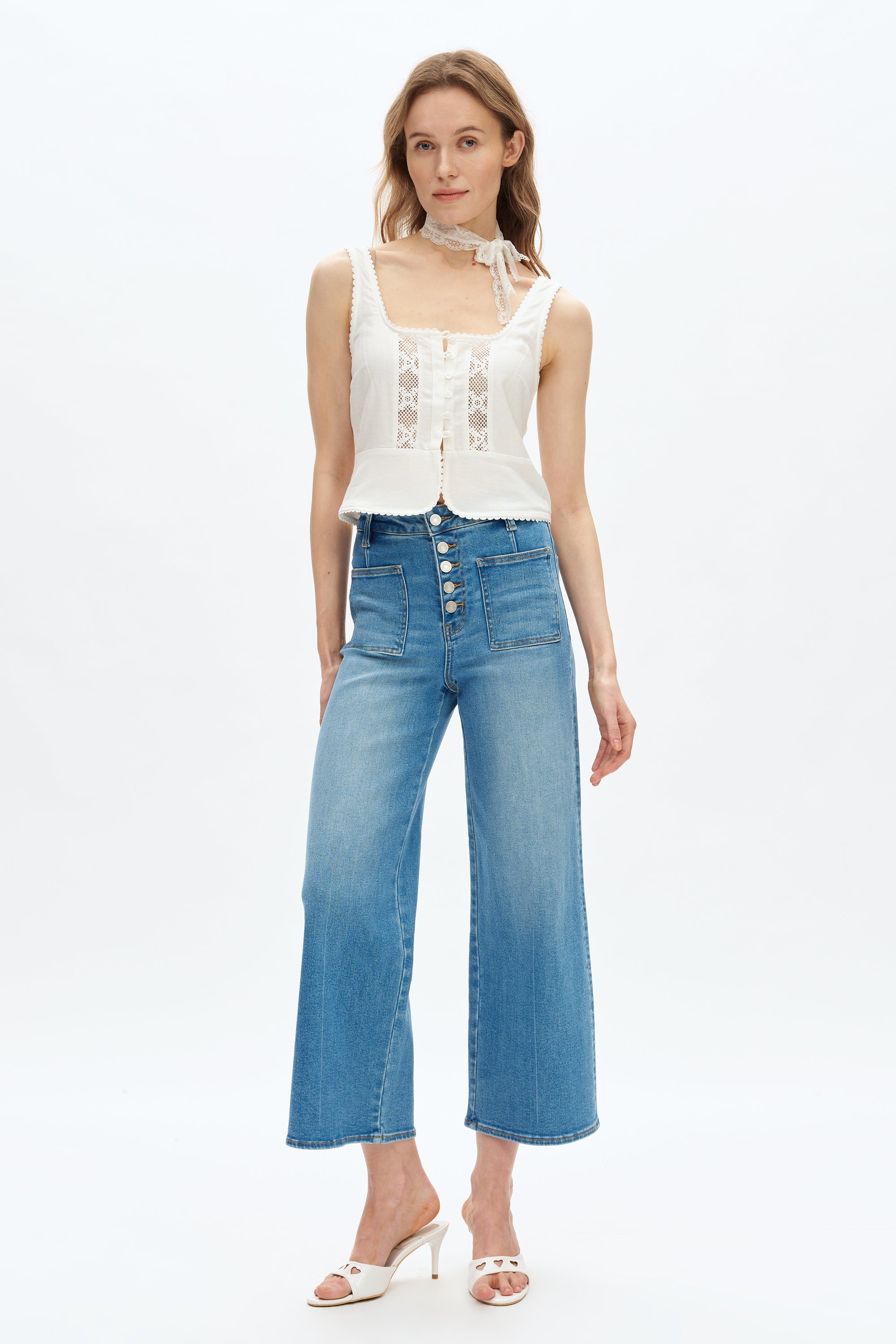 High rise button fly cropped wide leg denim jeans, mid-blue wash, front patch pockets, whiskering and hand-sanded effects, turned-up hem.