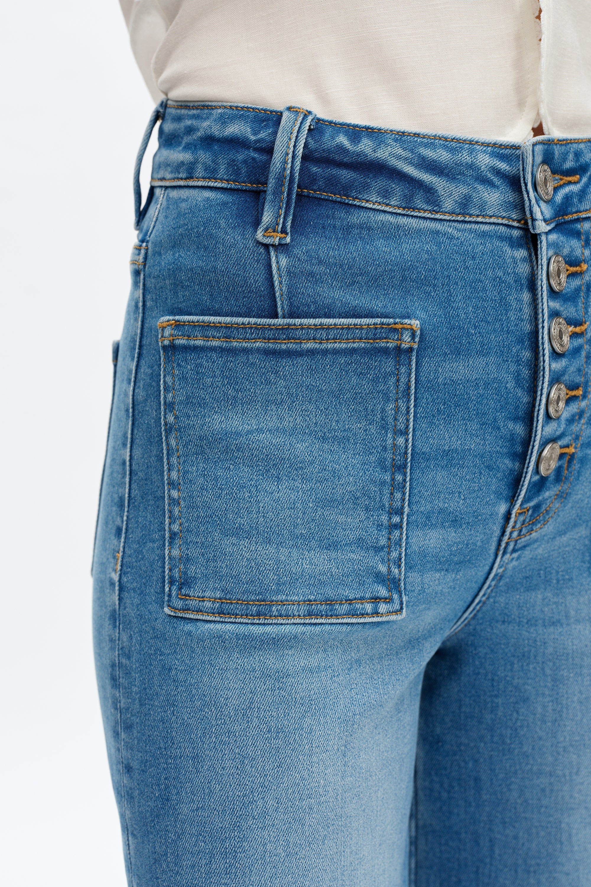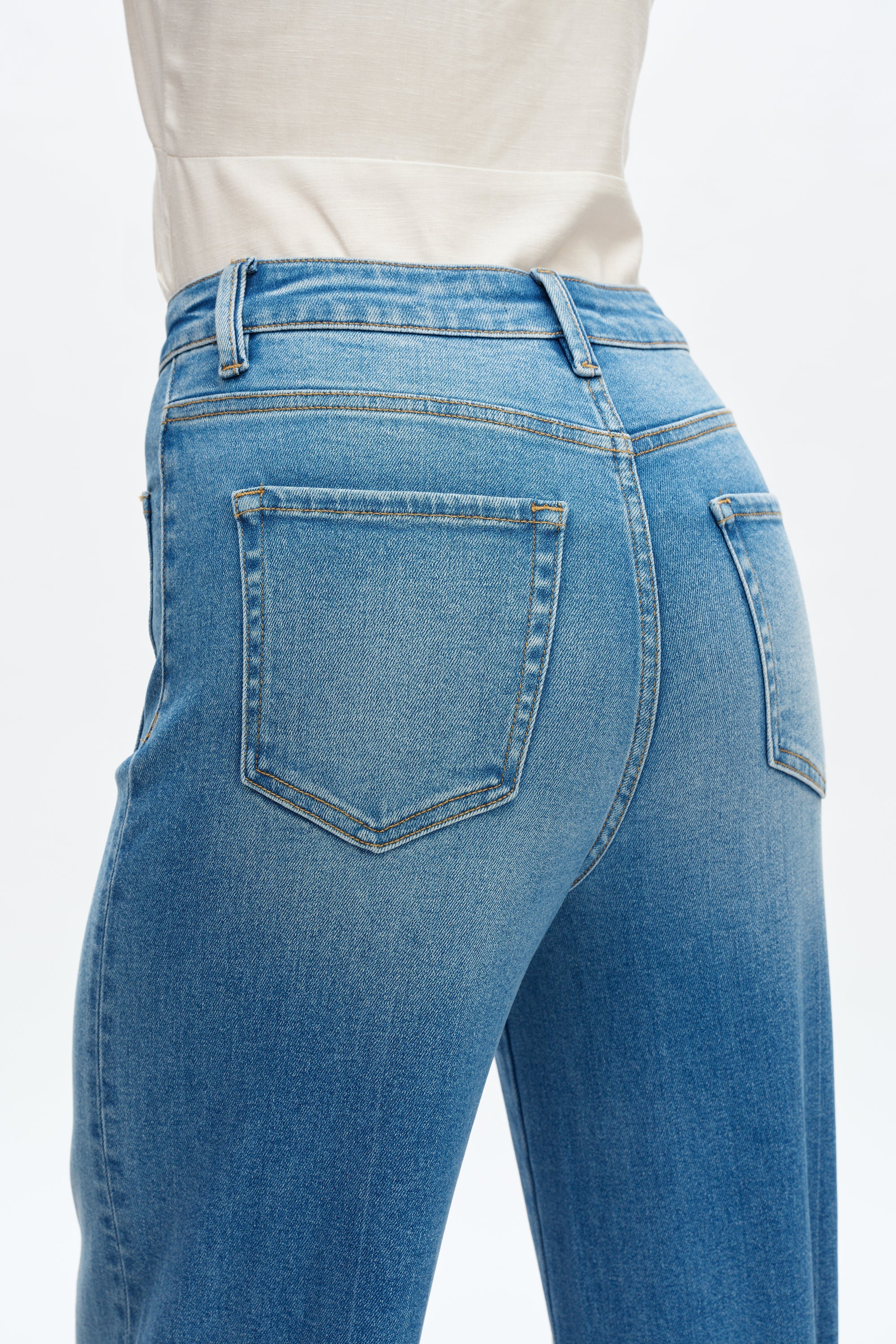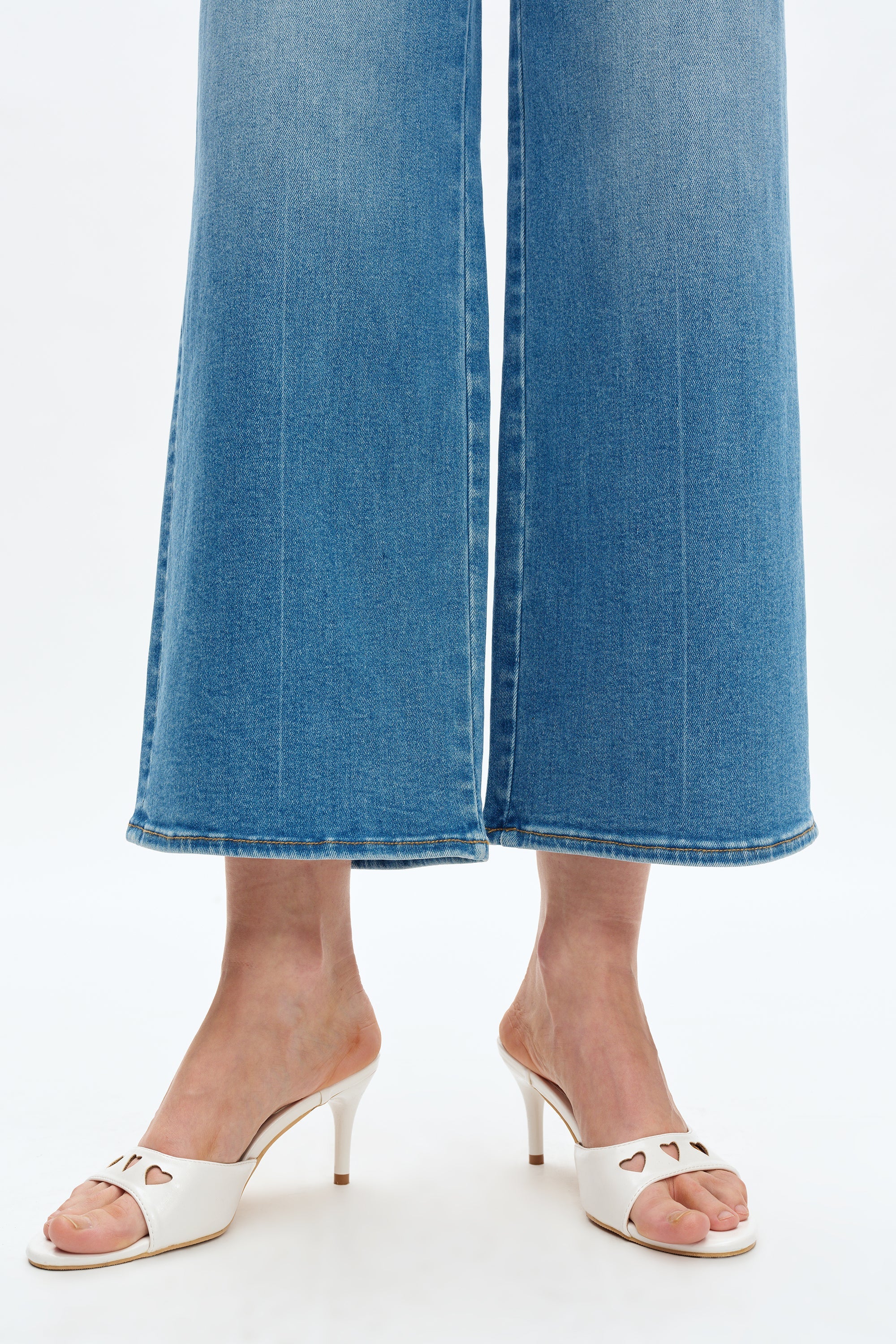 High rise button fly cropped wide leg denim jeans, mid-blue wash, front patch pockets, whiskering and hand-sanded effects, turned-up hem.