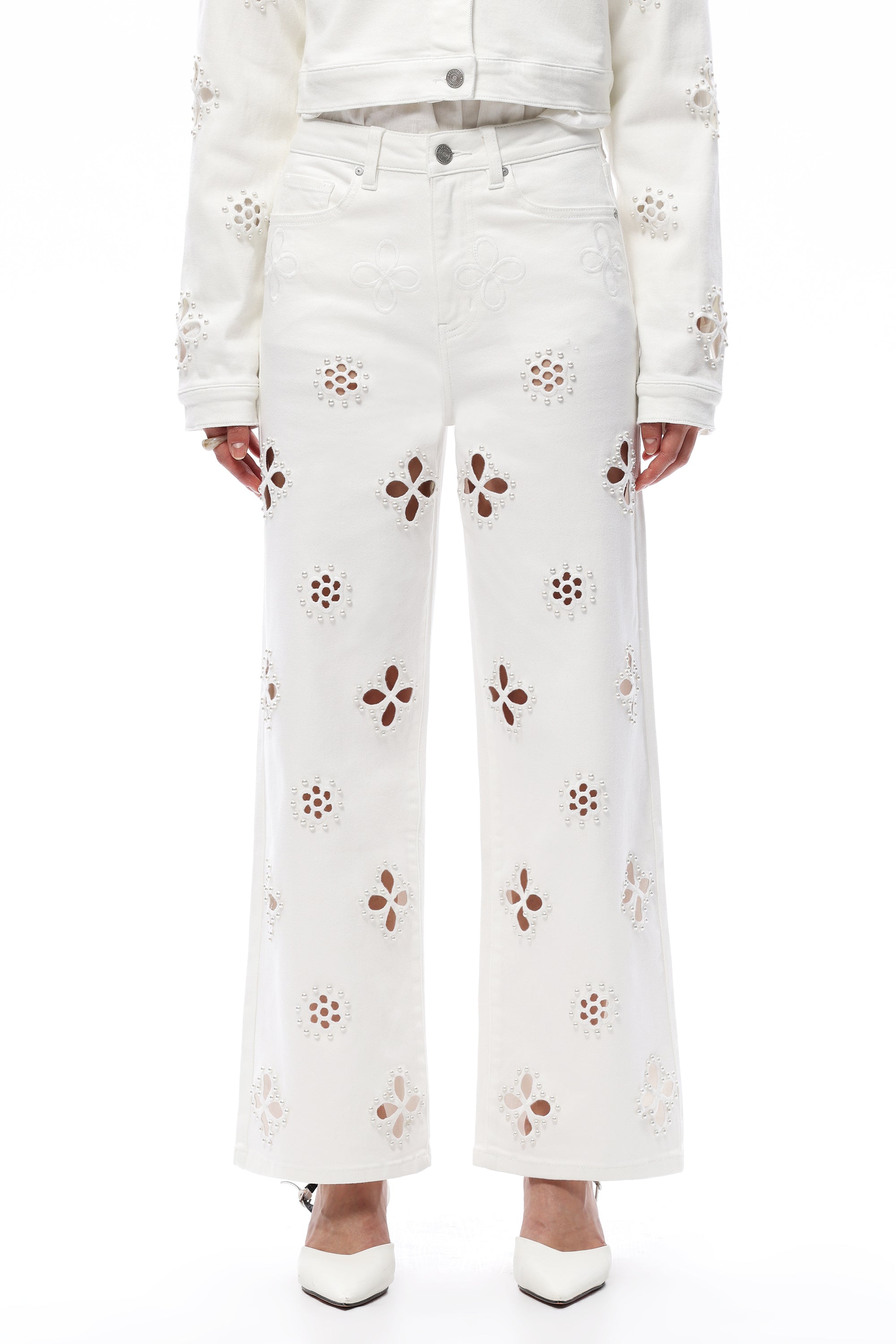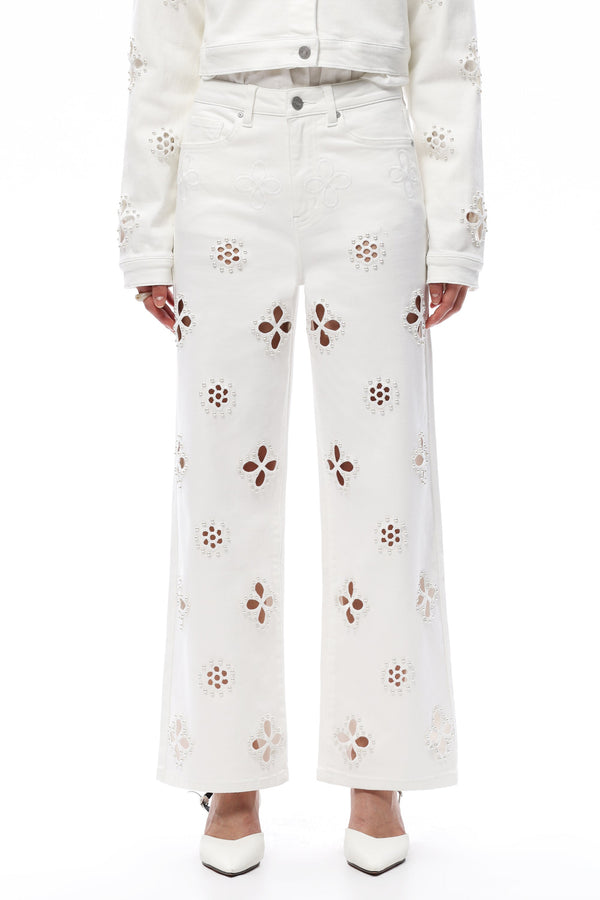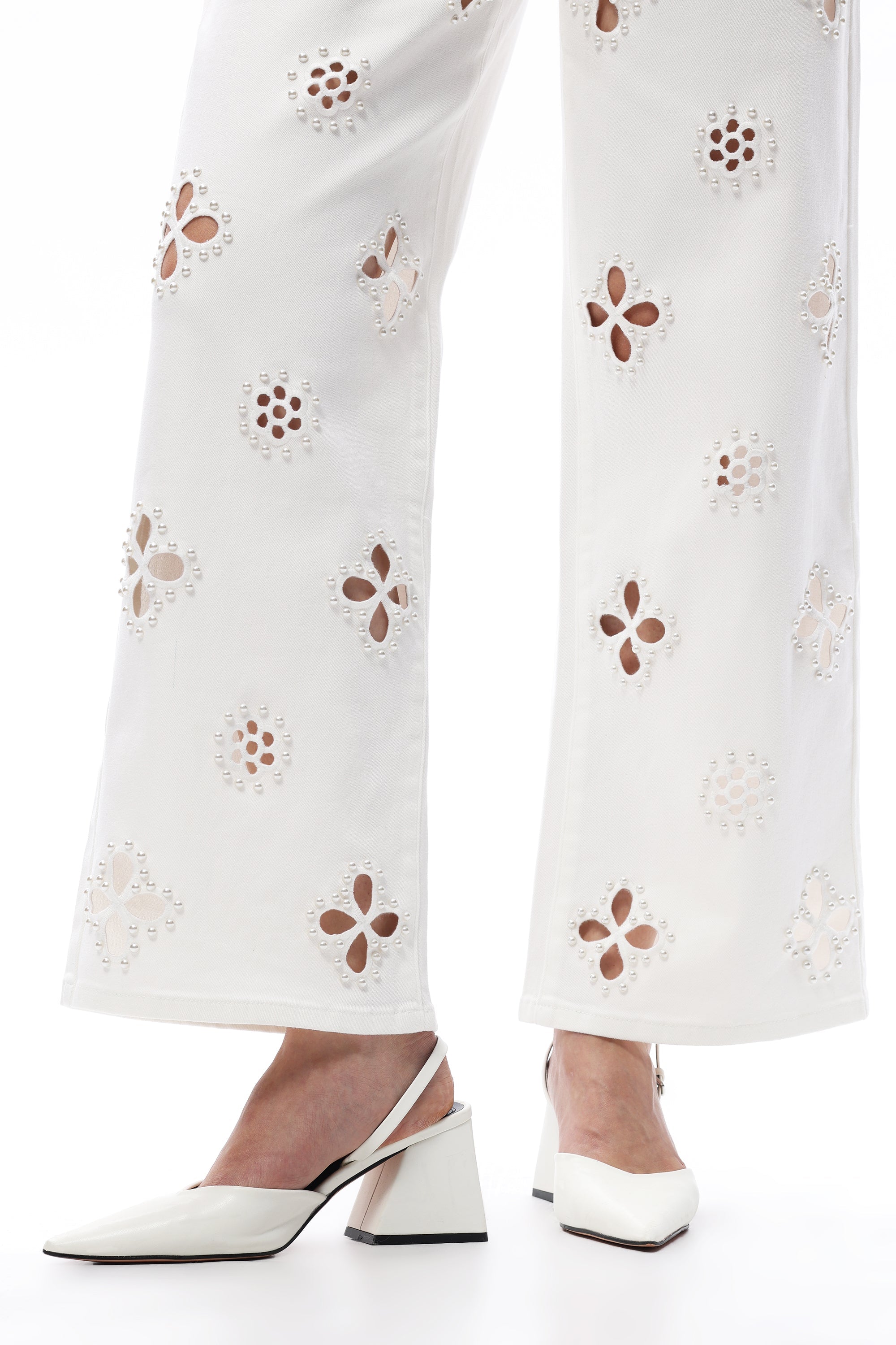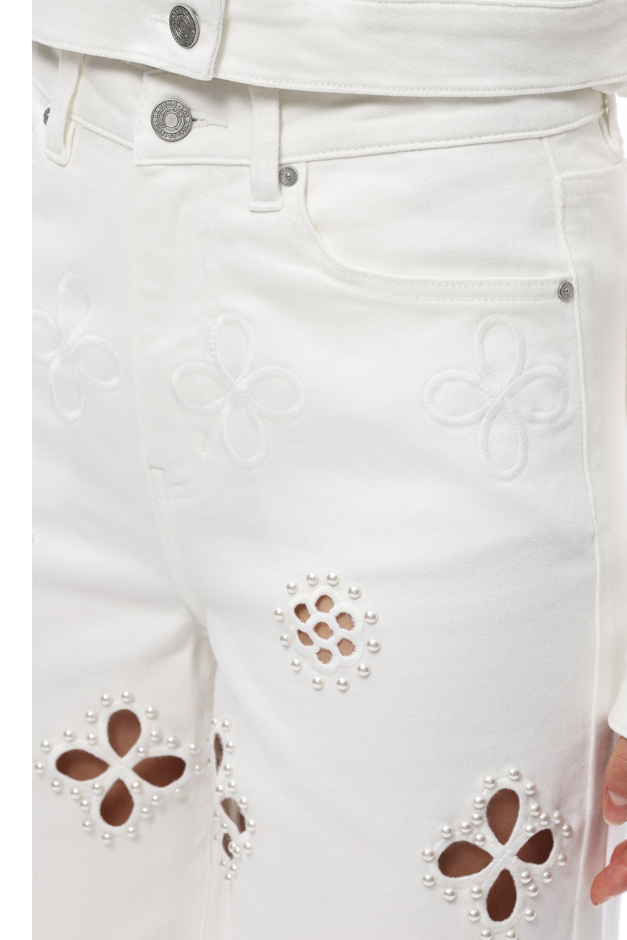 High rise straight leg jeans featuring multiple openwork embroidery details and pearl embellishments.