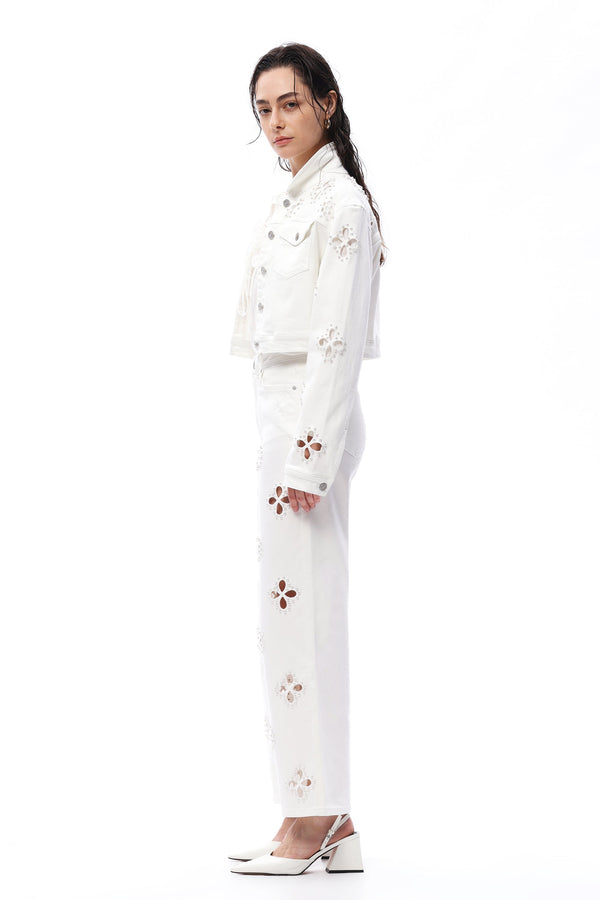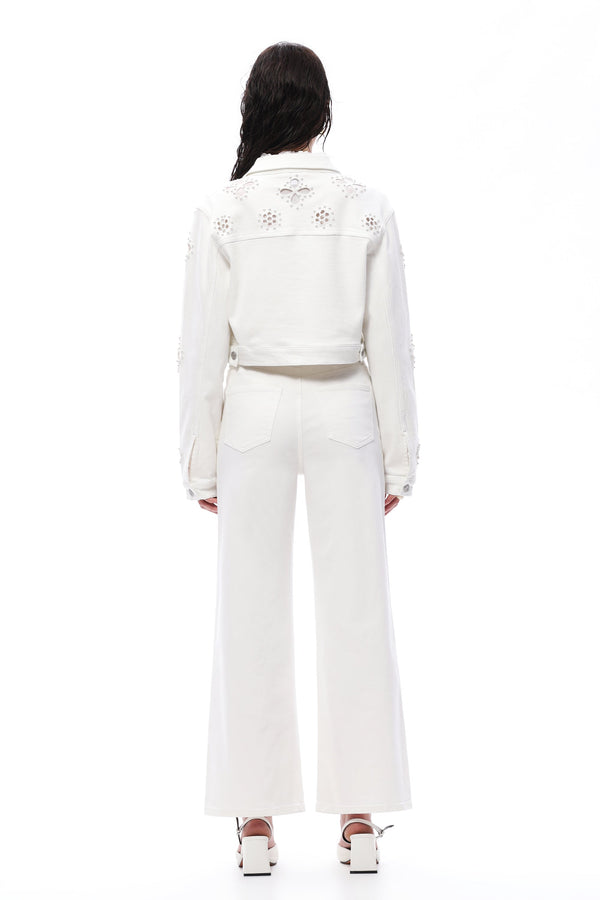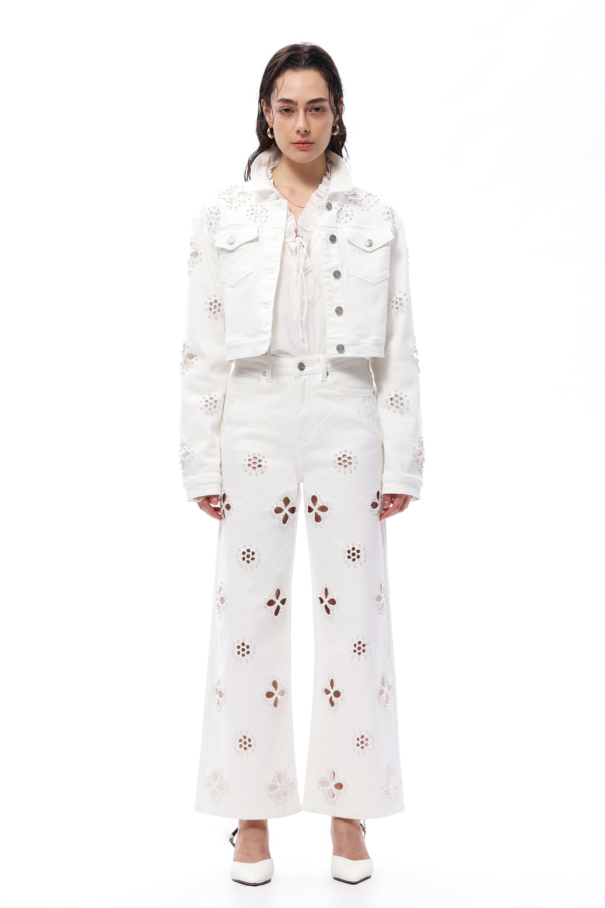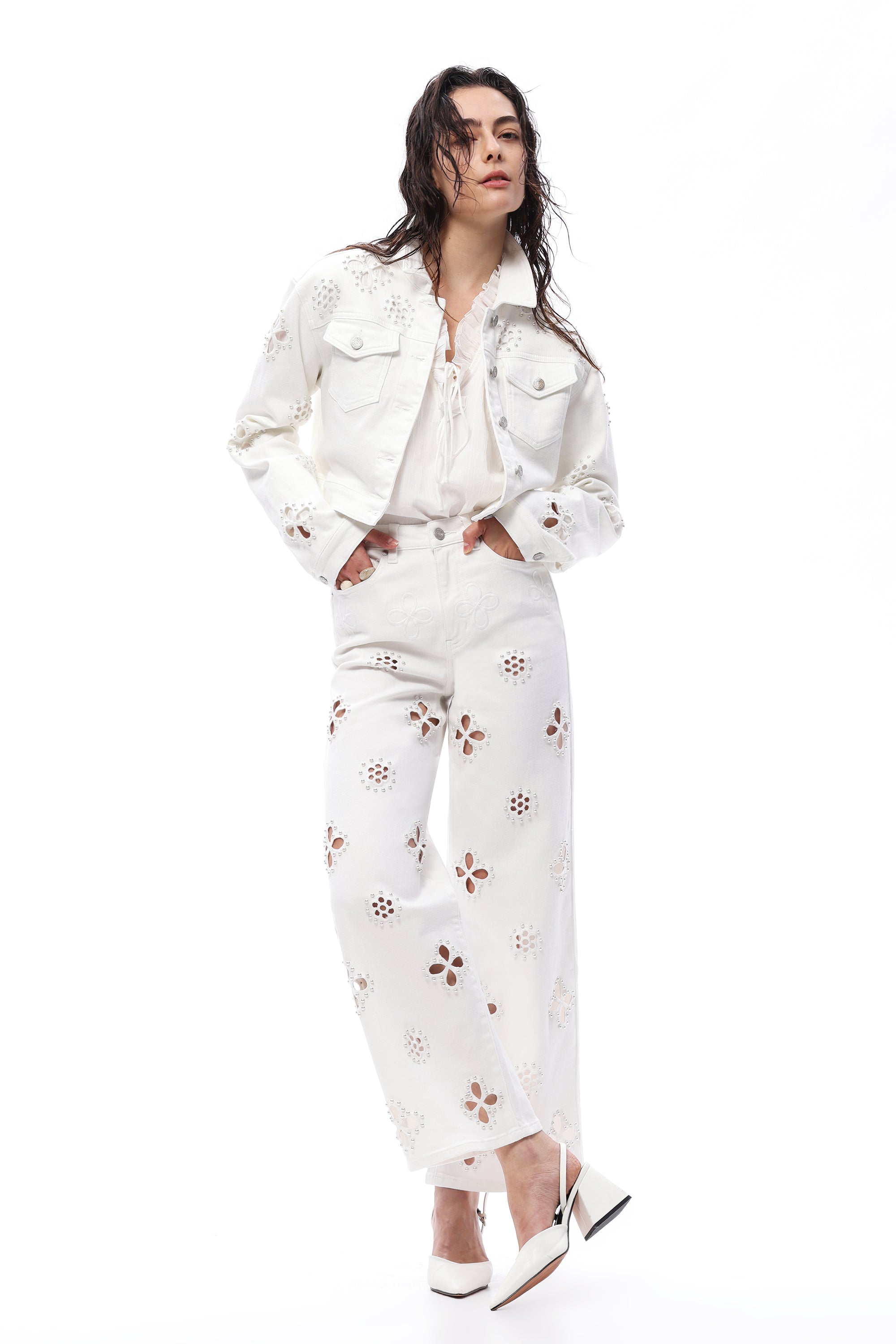 High rise straight leg jeans featuring multiple openwork embroidery details and pearl embellishments.