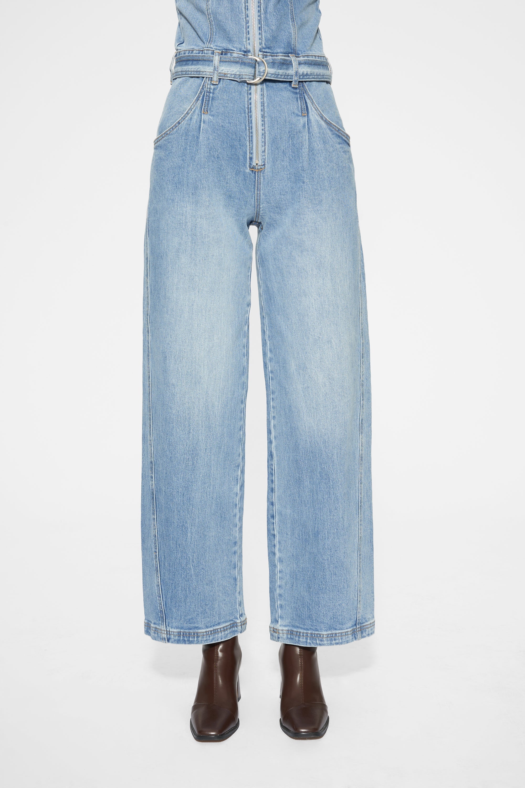 This chic denim jumpsuit features a strapless bustier top with a front zipper. The belted waist and wide, cropped legs create a modern silhouette.