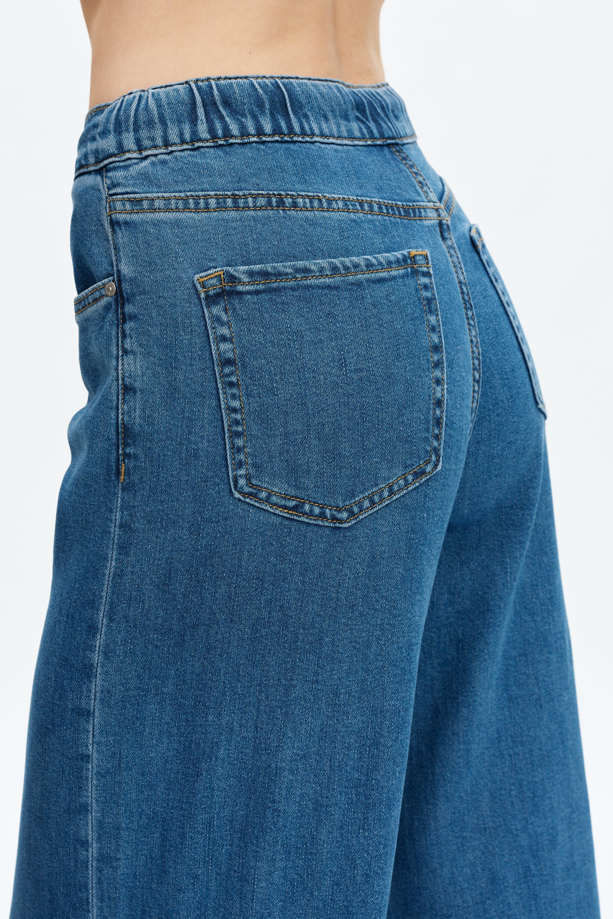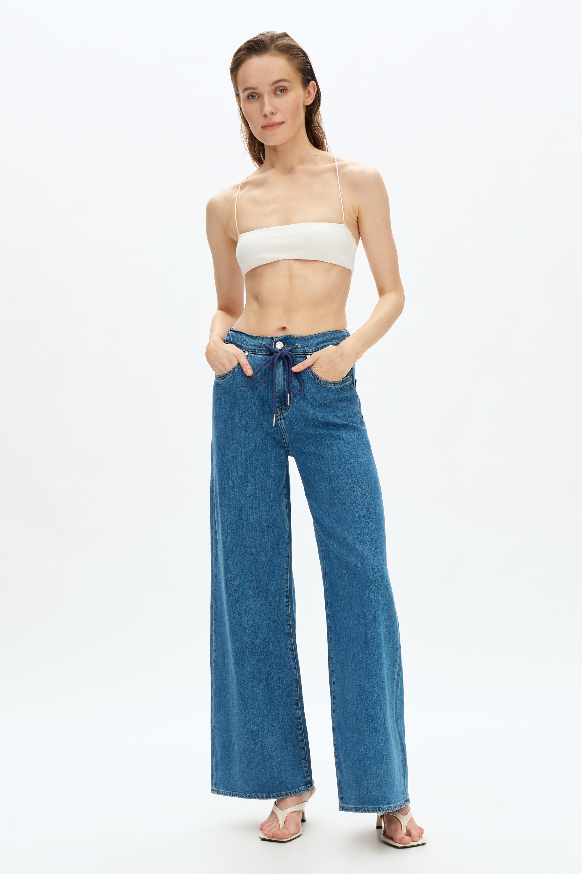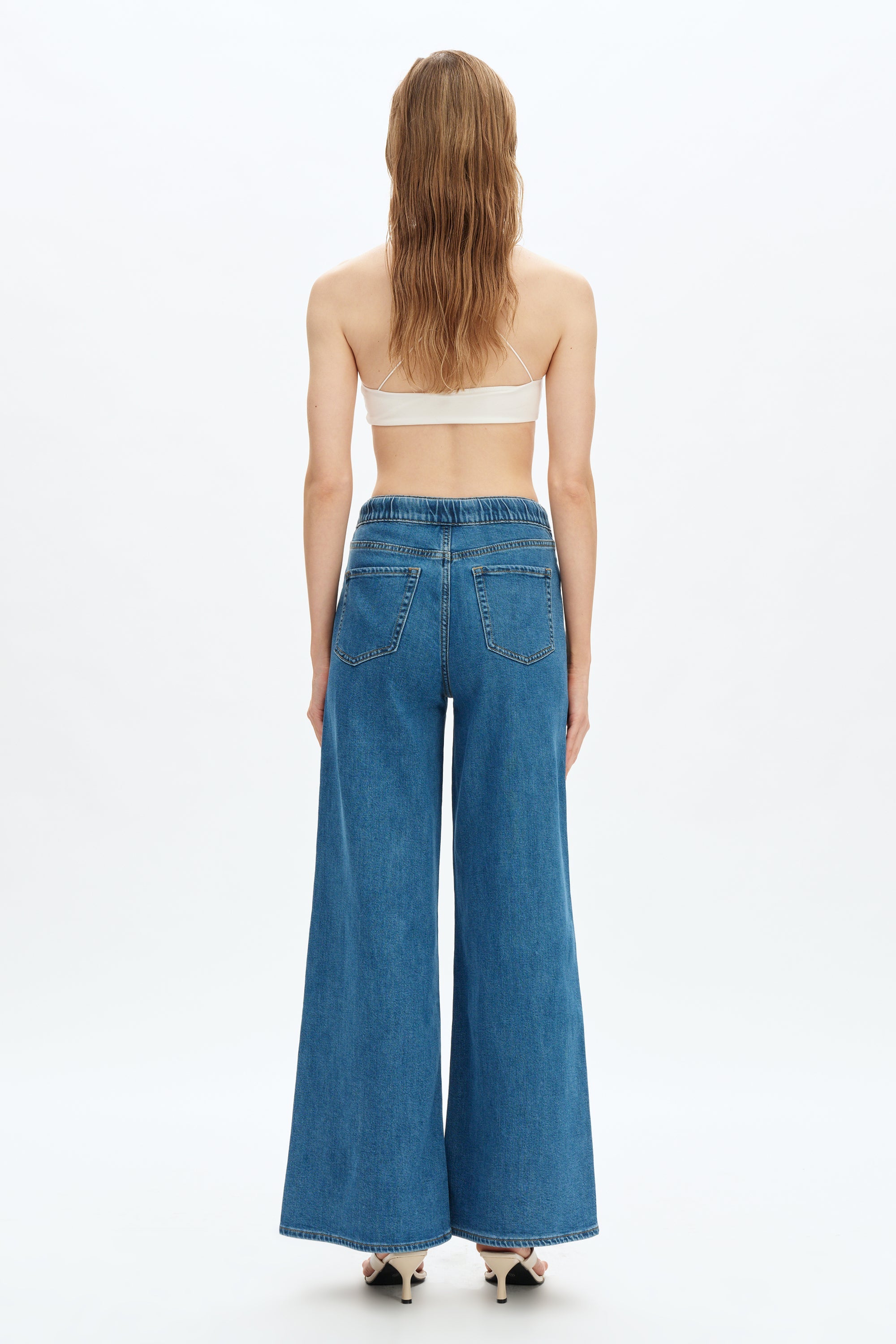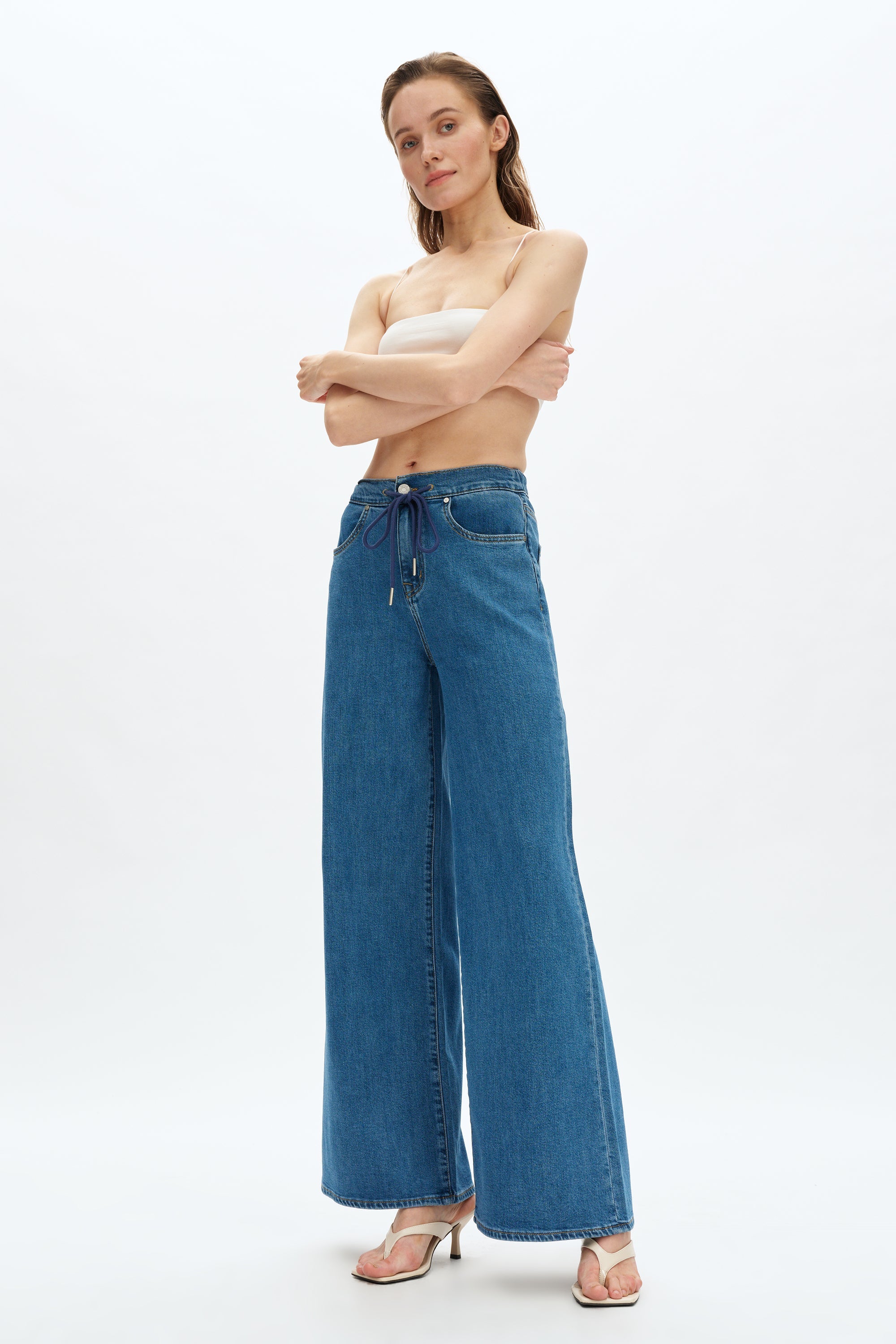 Mid rise wide leg denim jeans with a drawstring elastic waistband and minimal wash finish, creating an effortless, everyday look.