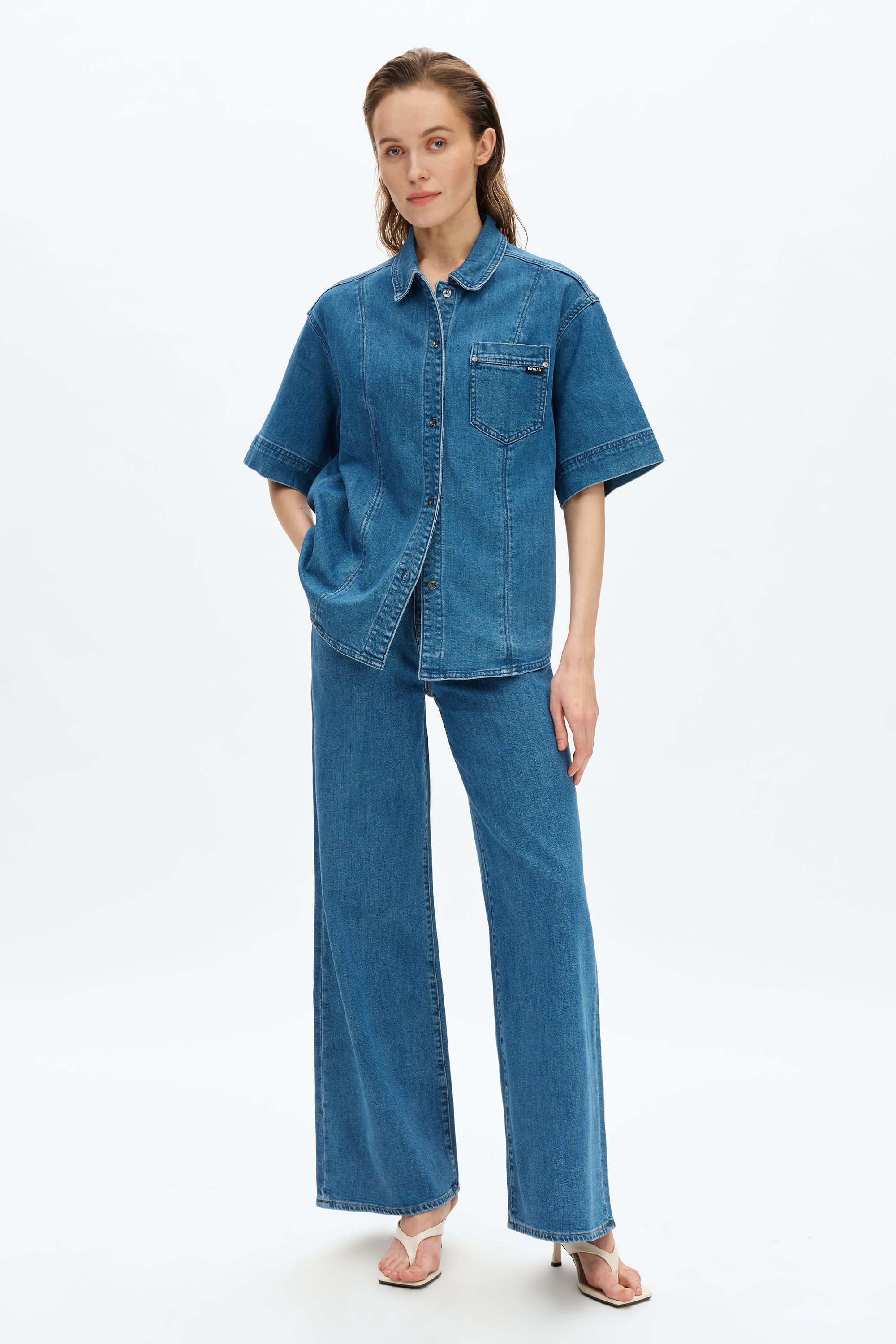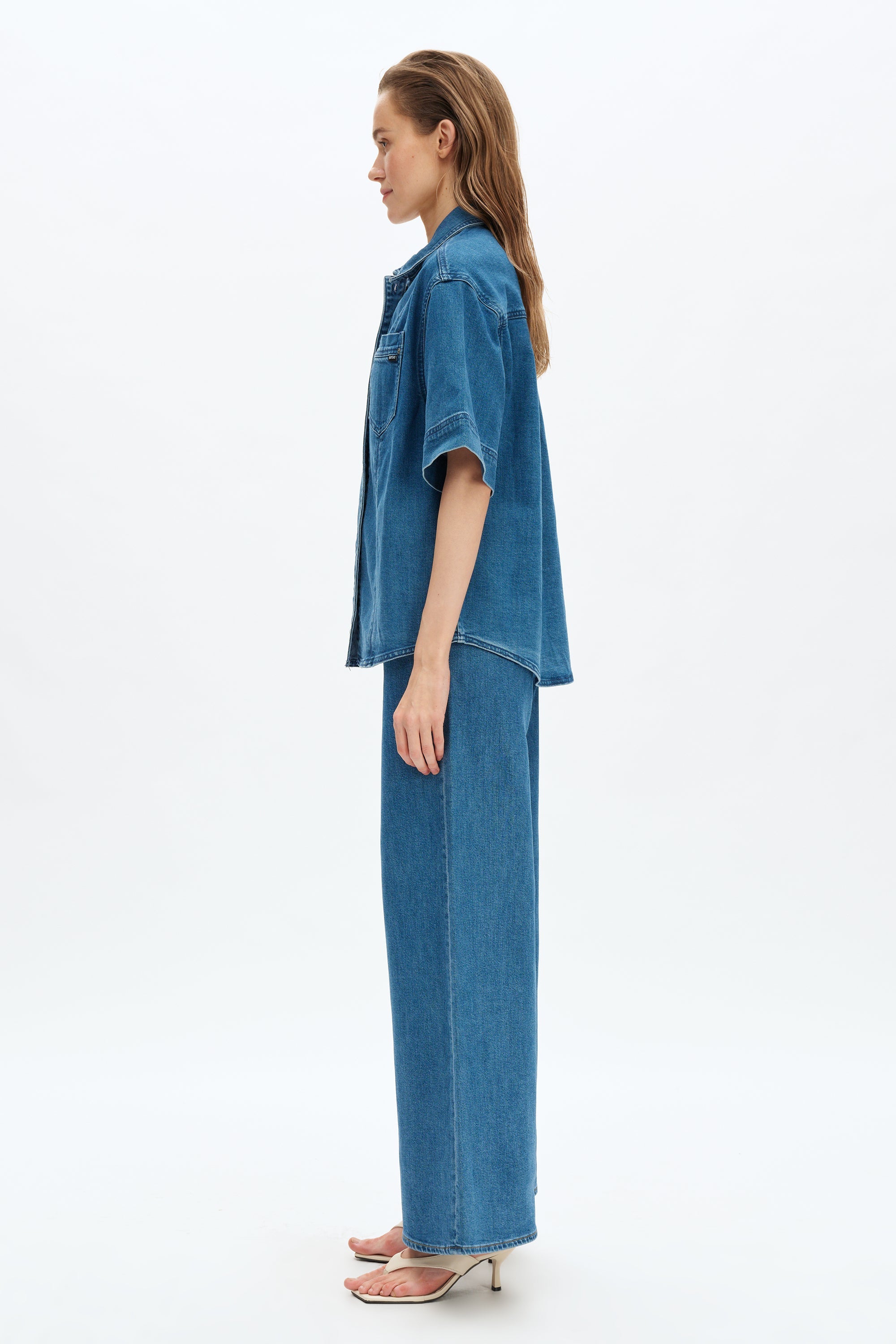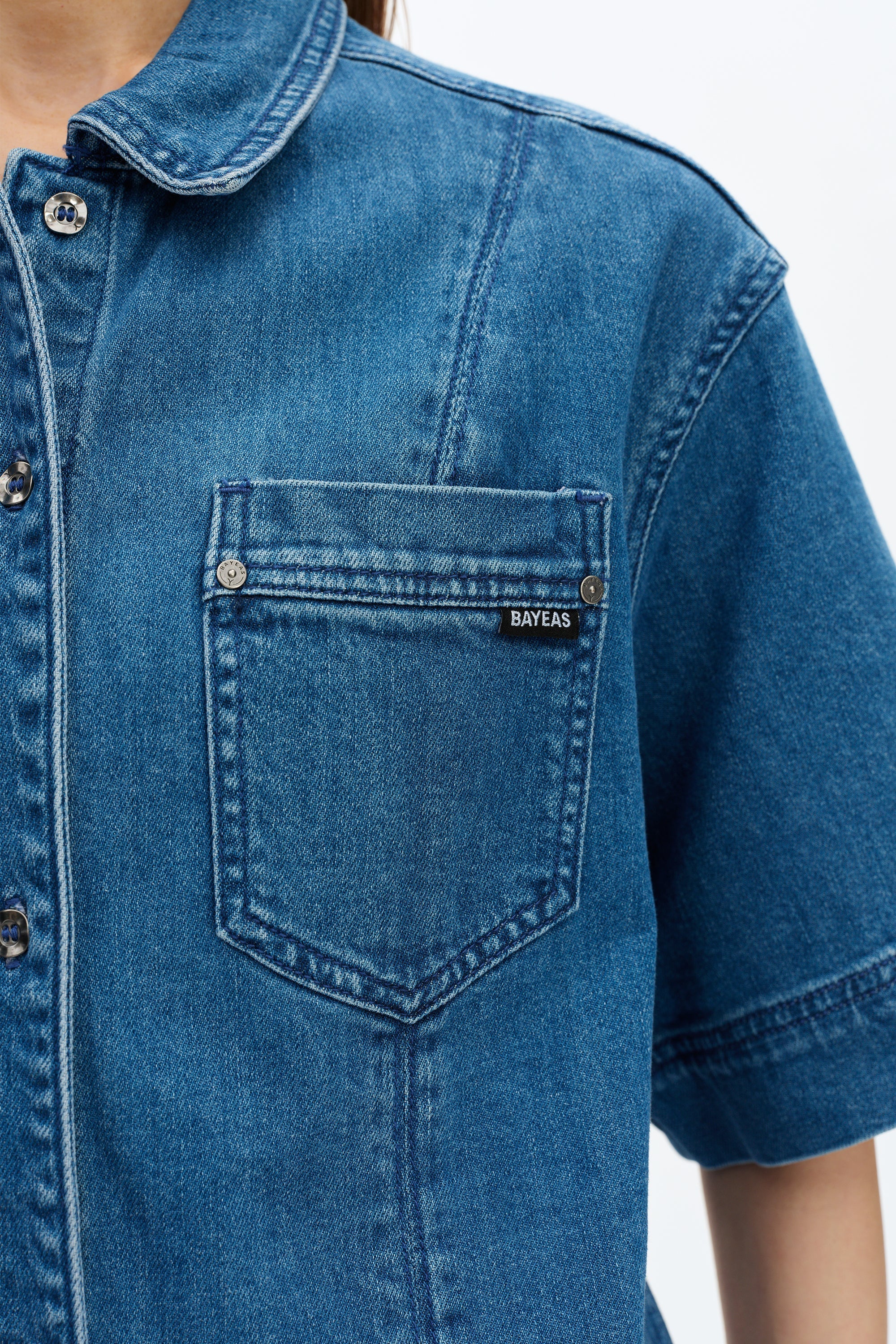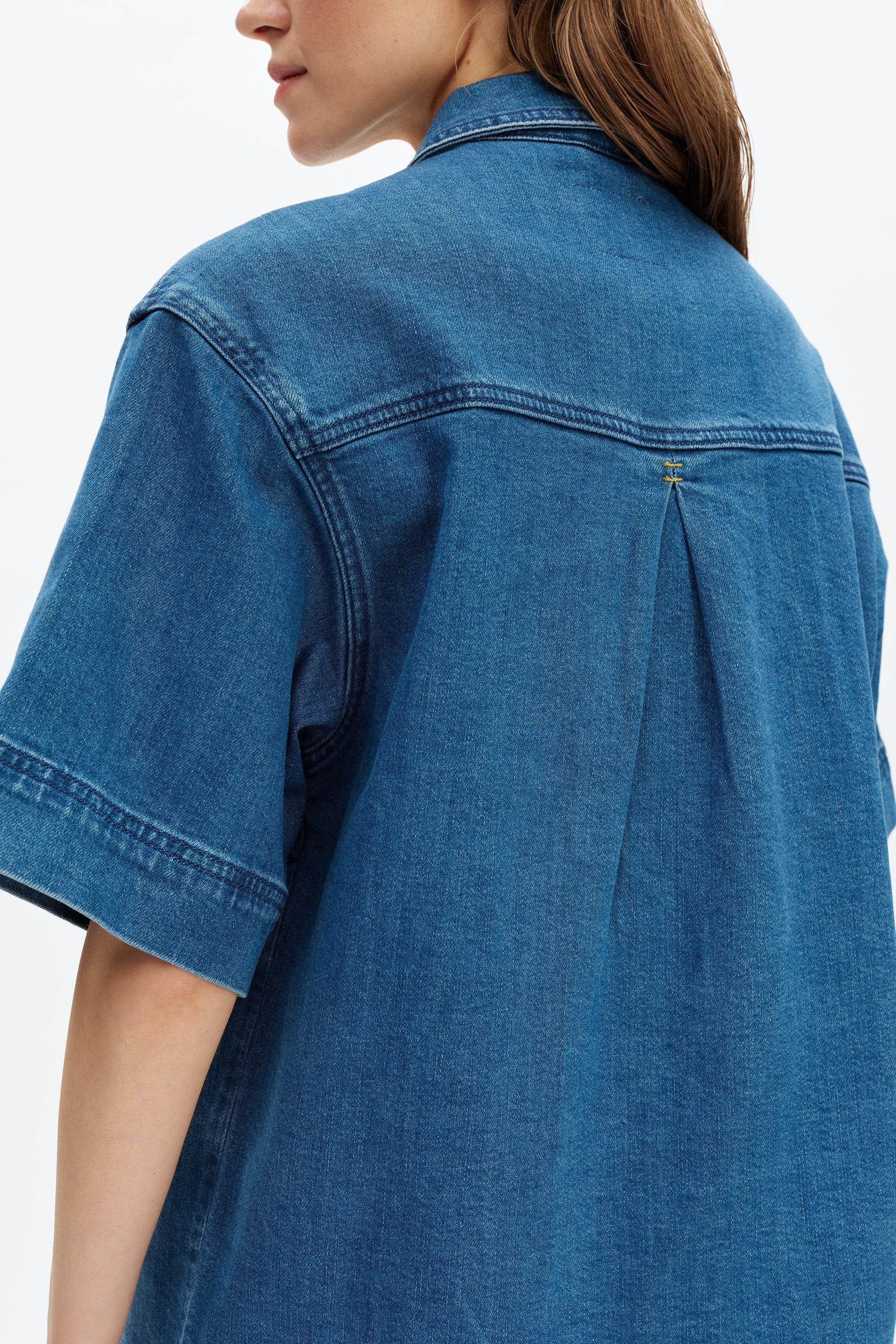 Denim short sleeve shirt, basic wash, multiple pressed crease details, relaxed half-sleeve design.